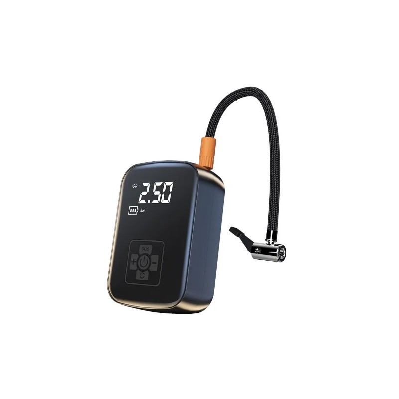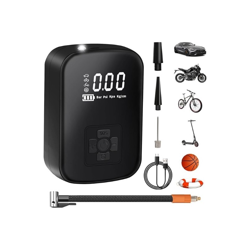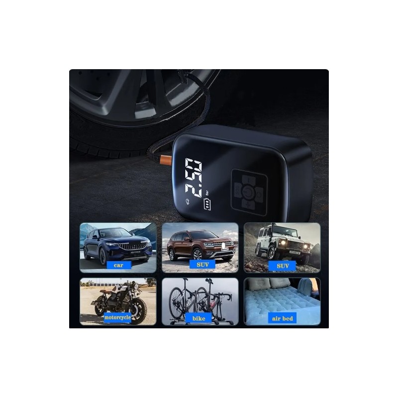 Compresor de aire electrico inalambrico. Se utiliza para inflar neumaticos de coches, moto, bicicletas, colchones inflables, balones, etc. Bateria de 4000mAh recargable por USB con autonomia de larga duracion. Dispone de una pantalla LCD que muestra la presion de inflado a tiempo real. Permite inflar hasta 150 PSI como presión máxima. Dispone de una linterna LED para usarlo en momentos de baja luminosidad. Modelo portable e inalambrico sin necesidad de cableado. Incluye 3 boquillas diferentes para coche, colchones y balones.