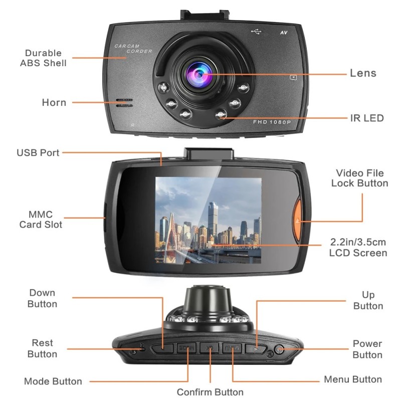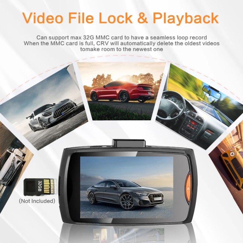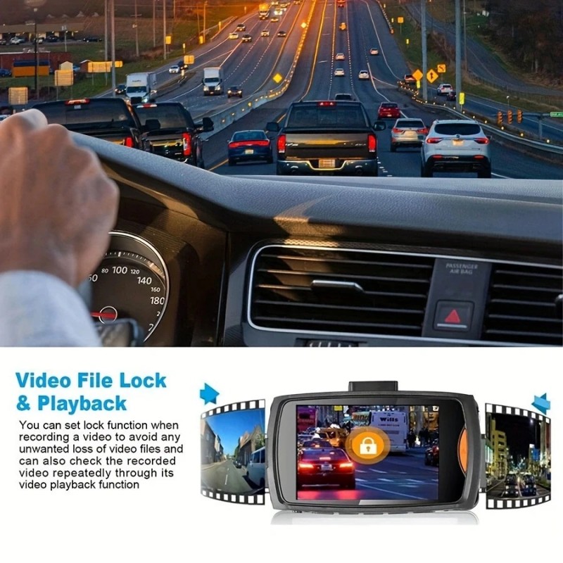 Camara de video dashcam DVR con resolucion full HD 1080p a color con sonido. Dispone de vision nocturna para grabacion en baja luminosidad. Deteccion de movimiento para inicio automatico de la grabación. Pantalla LCD a color de 2,4 pulgadas. Angulo de visión de 170 grados. Varias resoluciones de grabación. Acepta micro SD hasta 32 Gb. Se puede usar de camara de vigilancia o para grabar rutas. Incluye camara de coche HD, cargador de mechero, soporte de ventosa y manual de usuario.