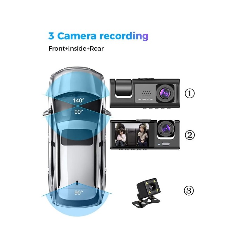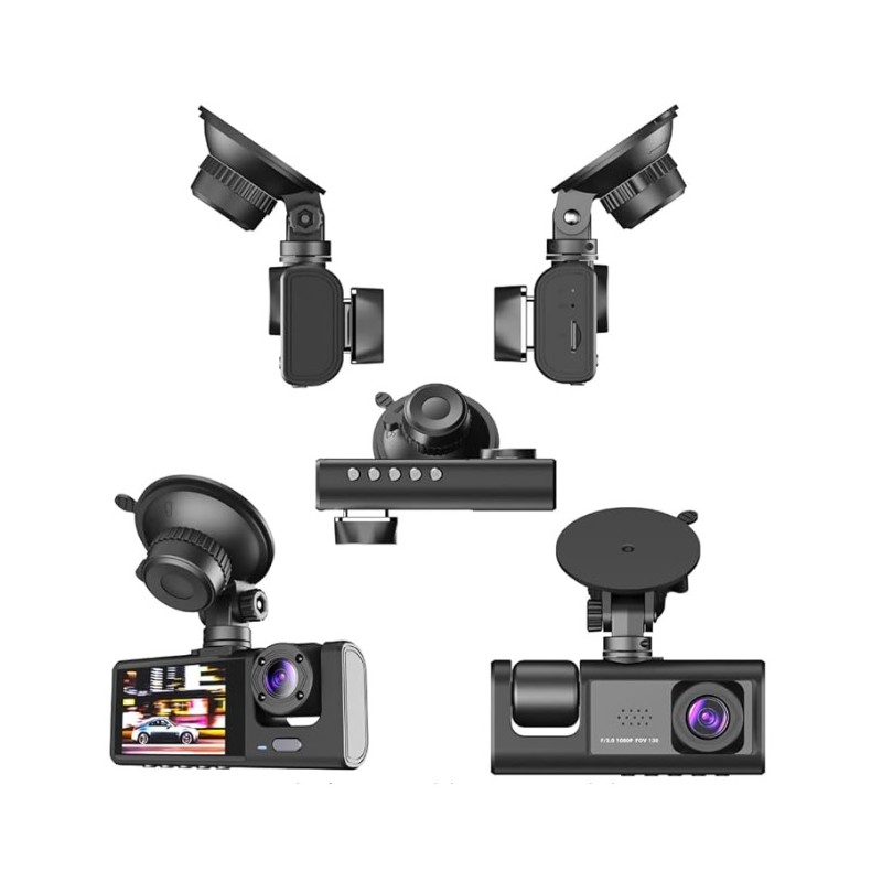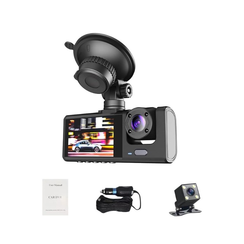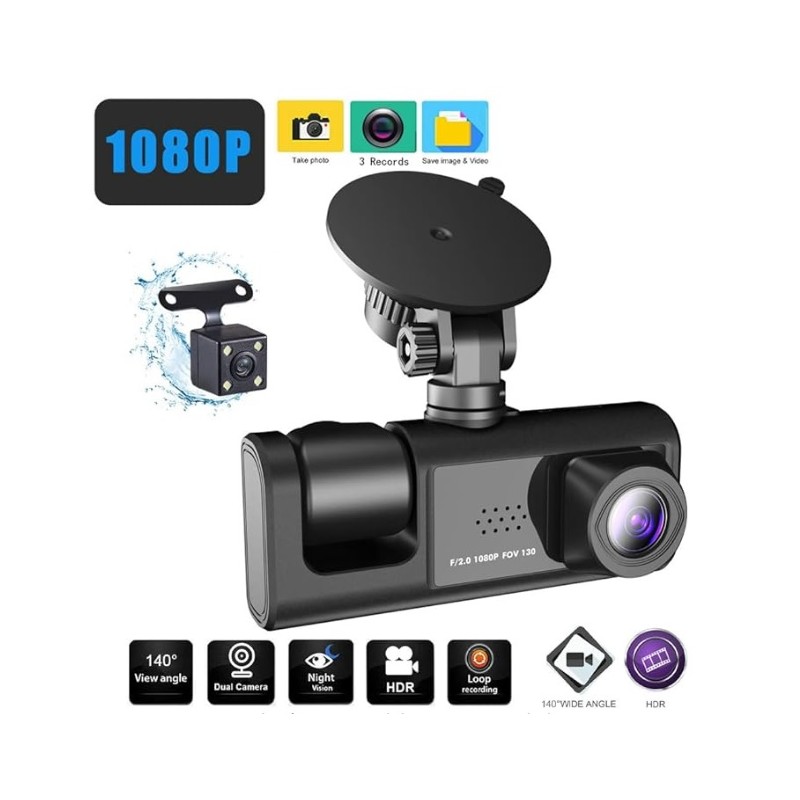 Camara DVR dashcam para coches. Dispone de 3 camaras para poder grabar al mismo tiempo la parte frontal, la parte interior y la parte trasera del vehiculo. El dispositivo incorpora 2 camaras con soporte giratorio y permite la conexion de una tercera camara trasera de aparcamiento. Resolucion full HD 1080p a color con sonido. Dispone de deteccion de movimiento para activar la grabacion automaticamente al detectar movimiento. Tiene vision nocturna para grabacion nitida en ambientes de baja luminosidad. Incorpora una pantalla LCD de 2 pulgadas. Acepta tarjeta micro SD hasta 128Gb (no incluida). Incluye camara DVR Dashcam con doble camara, camara de aparcamiento trasera, cargador y manual de usuario.