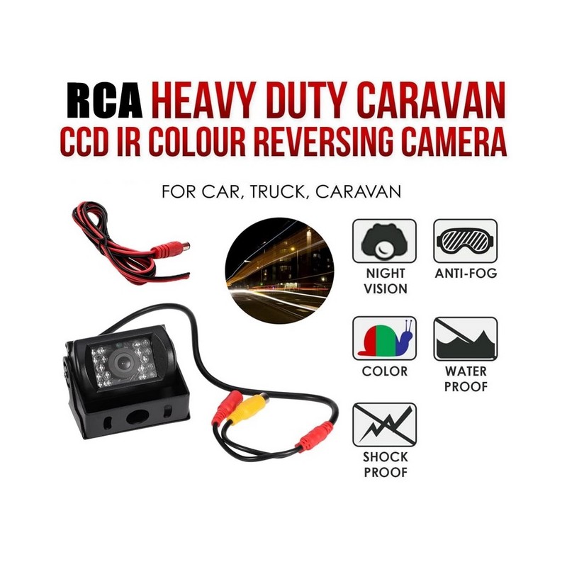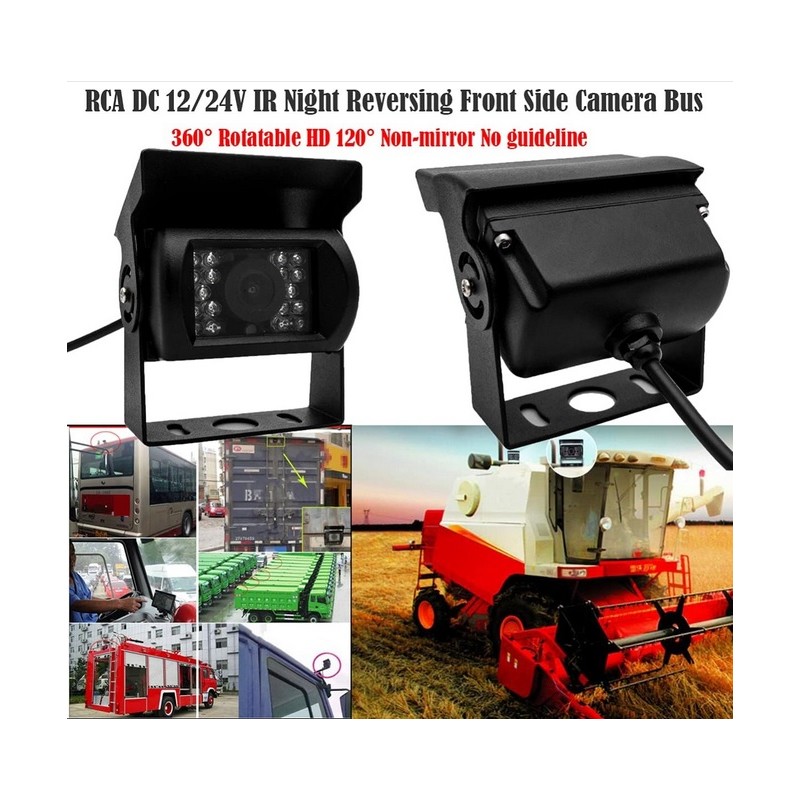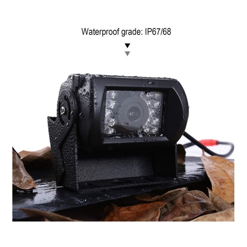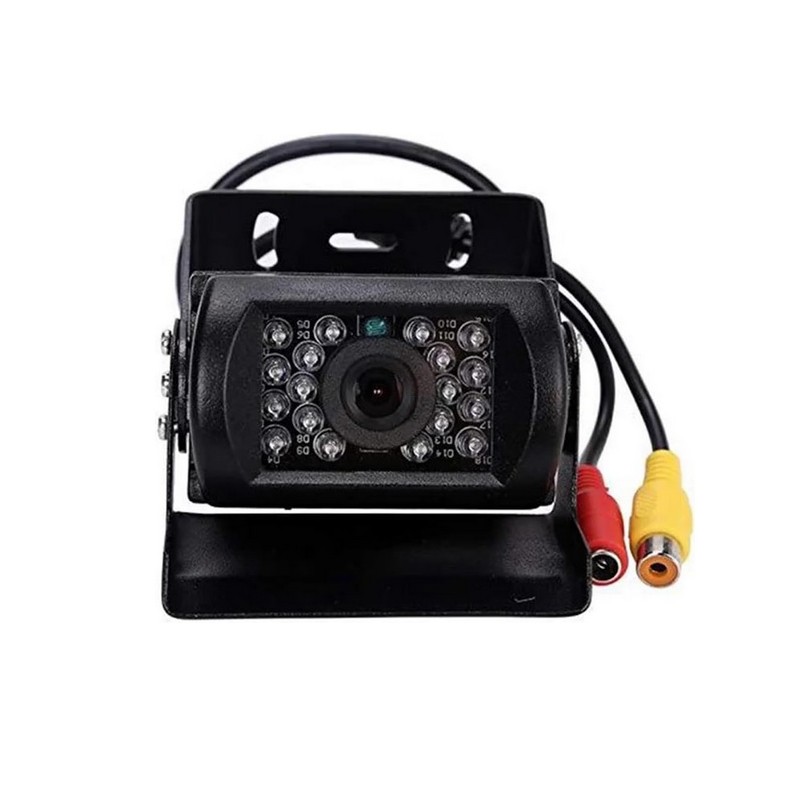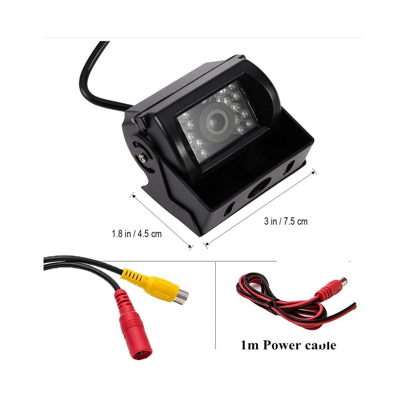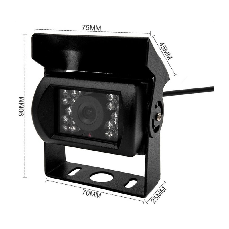 Camara de marcha atras para aparcamiento. Modelo impermeable con proteccion IP67. Angulo de vision de 170 grados. Dispone de 18 LEDs infrarrojos para vision nitida con baja luminosidad. Dispone de un soporte metalico rotatorio con visera solar. Valida para coches, furgonetas, camiones, autobuses, tractores, etc. Incluye camara de aparcamiento y cable con conexion RCA.
