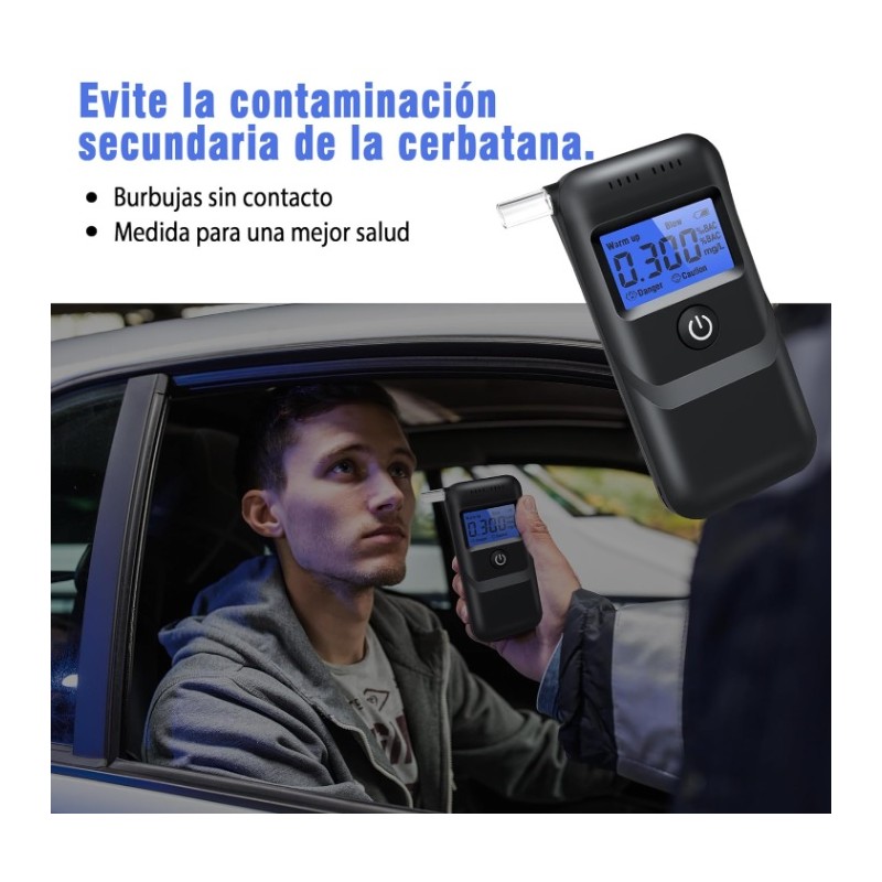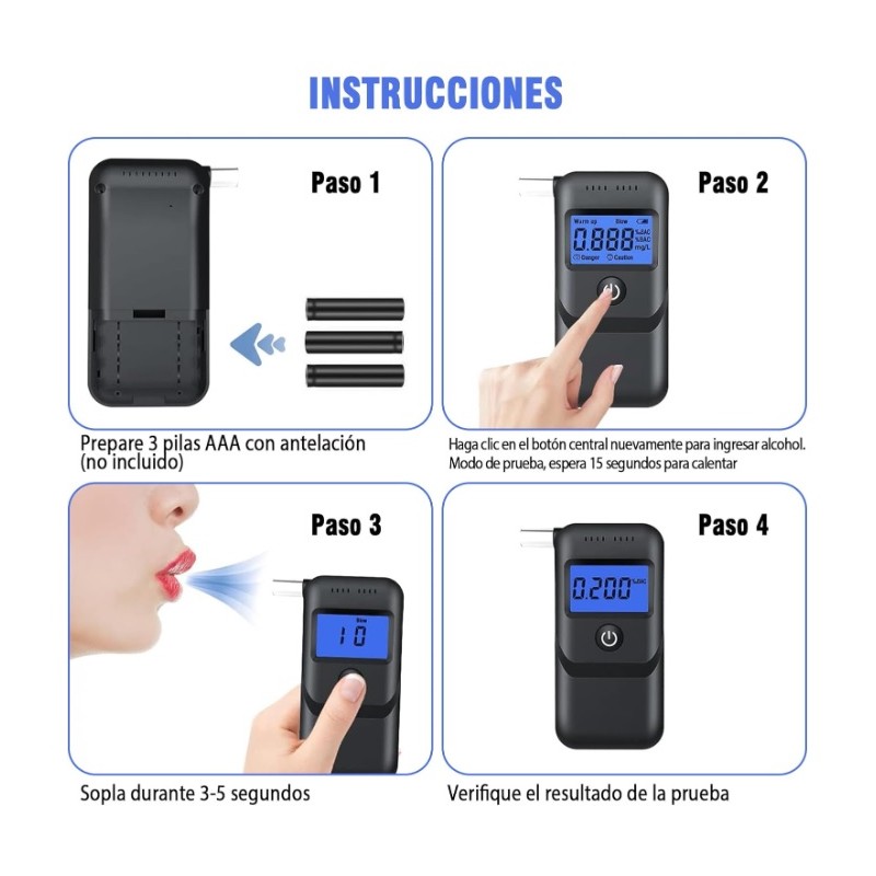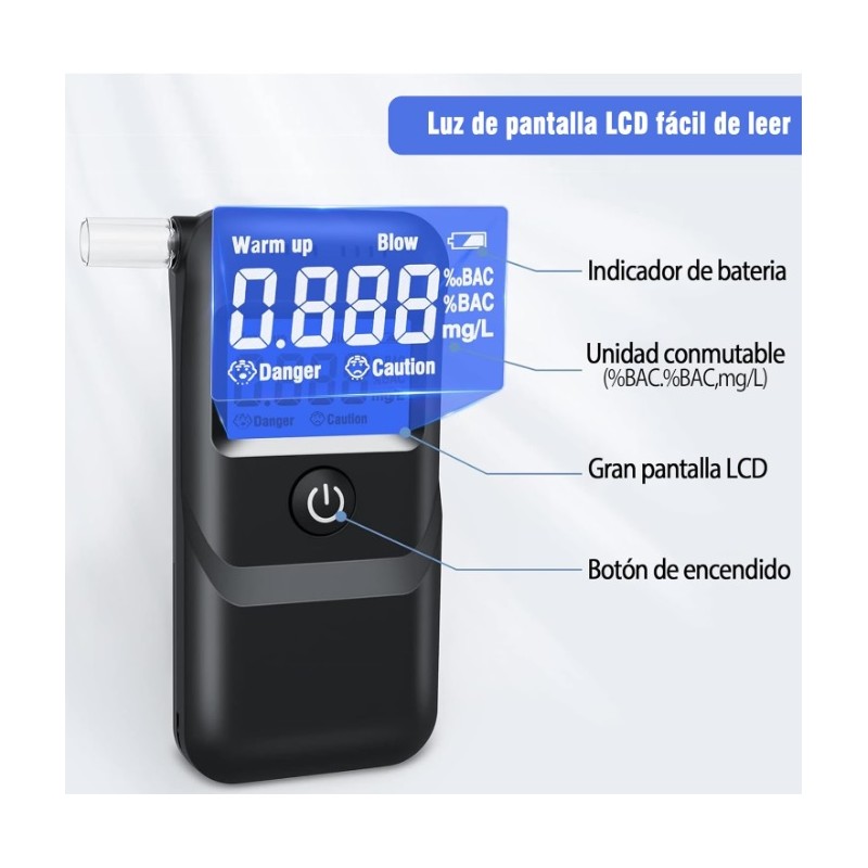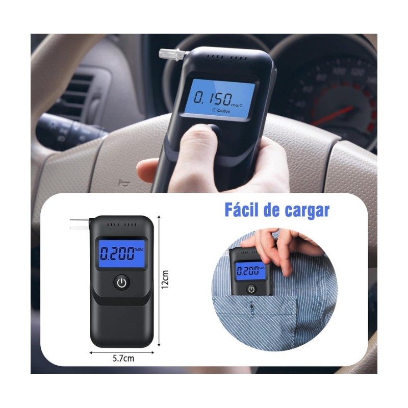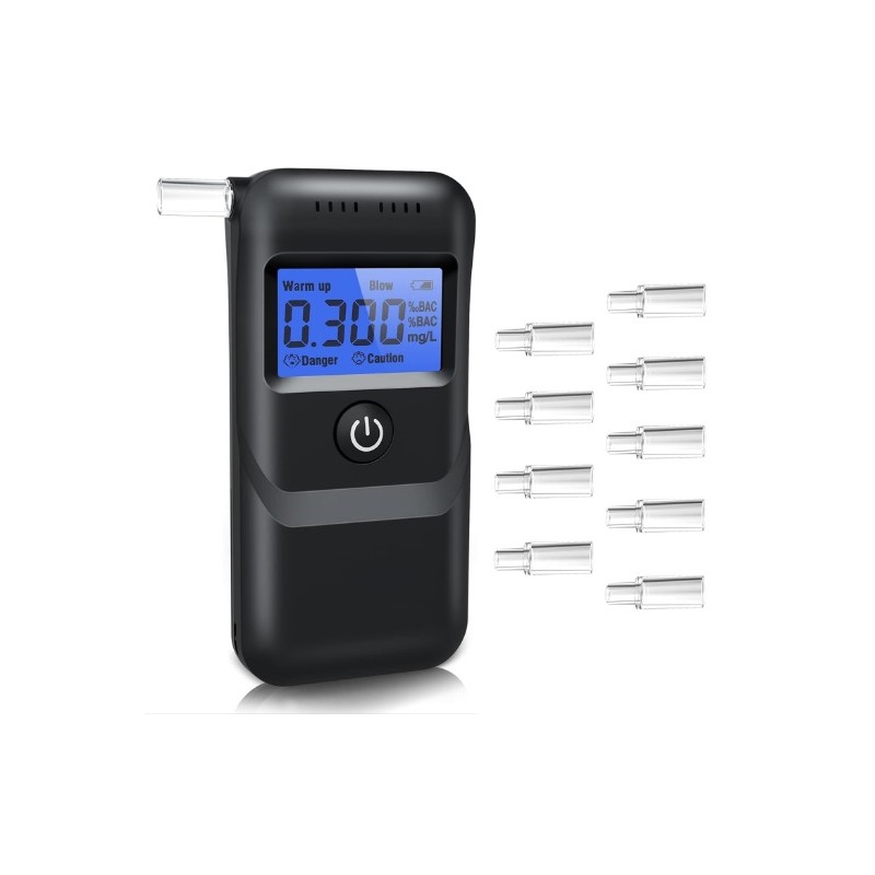 Alcoholimetro digital profesional con homologacion. Indica la cantidad de alcohol en sangre. Medicion muy precisa. Dispone de pantalla LCD retroiluminada. Incluye 10 boquillas de recambio que se pueden limpiar y reutilizar. Funciona con 3 pilas AAA (no incluidas). Modelo portable facil de transportar. Incluye alcoholimetro digital, 10 boquillas y manual de usuario. Excelente rendimiento.