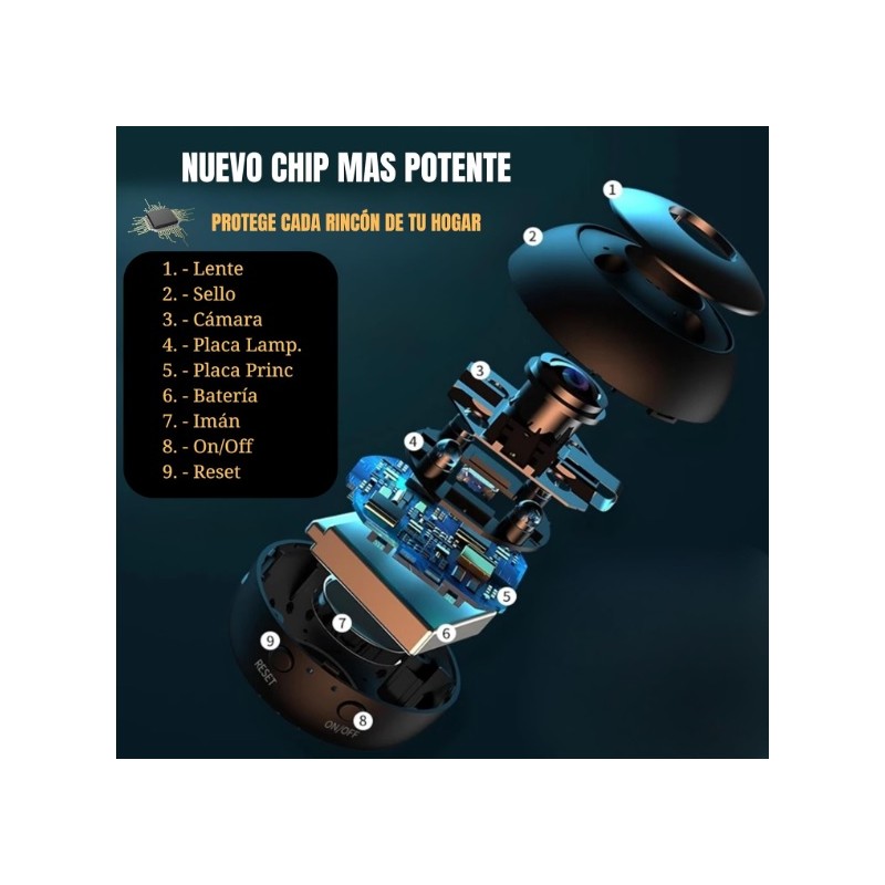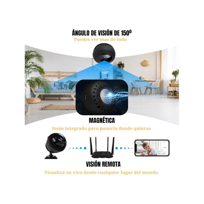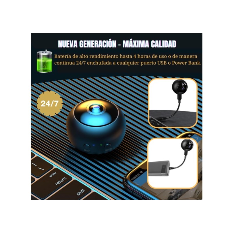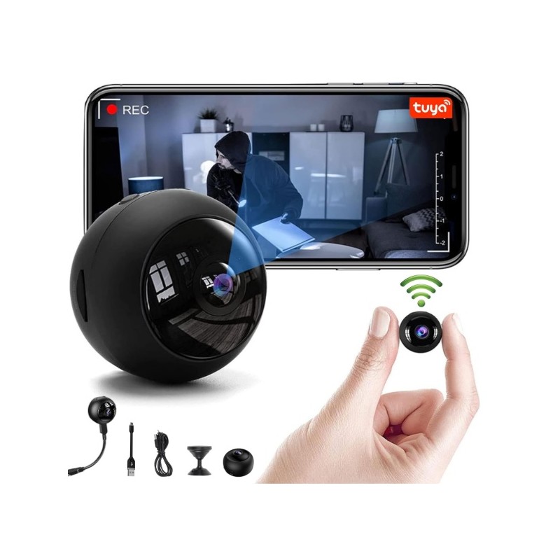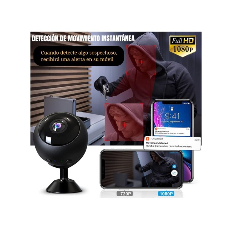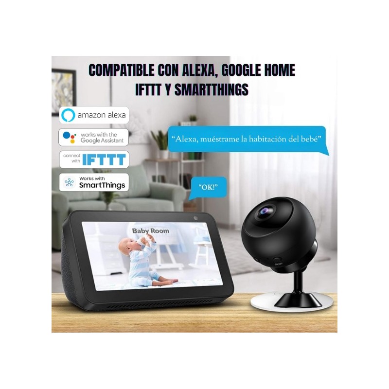 Mini camara espia wifi IP HD 1080p con vision nocturna. Permite visualizar a tiempo real desde su telefono movil y grabar videos a color en resolucion HD 1080p con sonido. Deteccion de movimiento. Acepta tarjeta de memoria micro SD hasta 128GB. Bateria recargable por USB con autonomia de bateria de 4 horas aproximadamente, conectada a un cargador USB puede grabar 24 horas al dia. Compatible con Alexa y Google Home para controlar la camara mediante comandos de voz. Dispone de una APP compatible con Iphone y Android con la cual puede ver el video a tiempo real y recibir notificaciones de alerta entre otras muchas funciones. Con esta camara podra controlar su casa, local, negocio u oficina en todo momento a tiempo real desde su movil, tablet o PC. Incluye mini camara espia IP HD wifi, soporte, cable USB y manual de usuario.