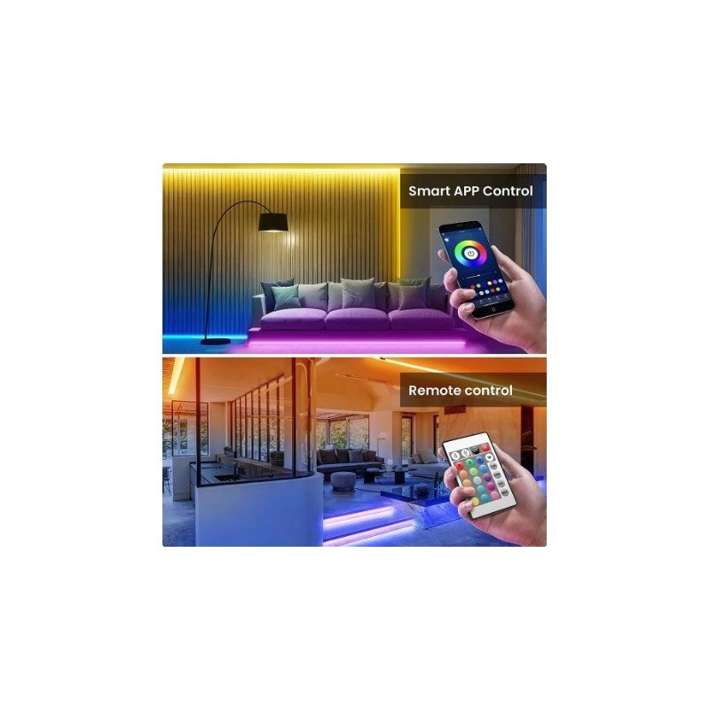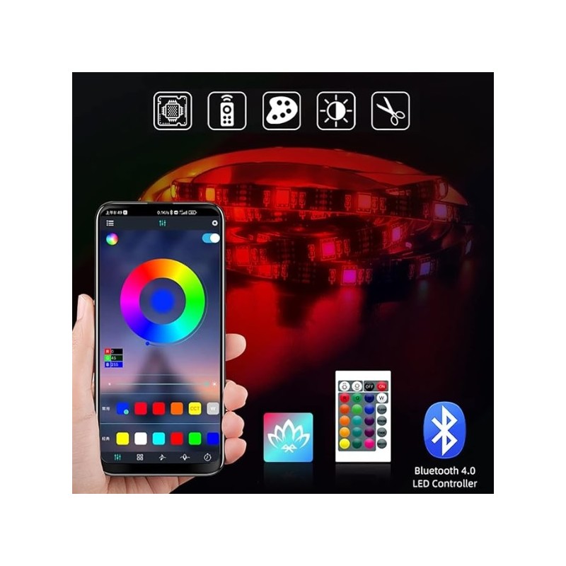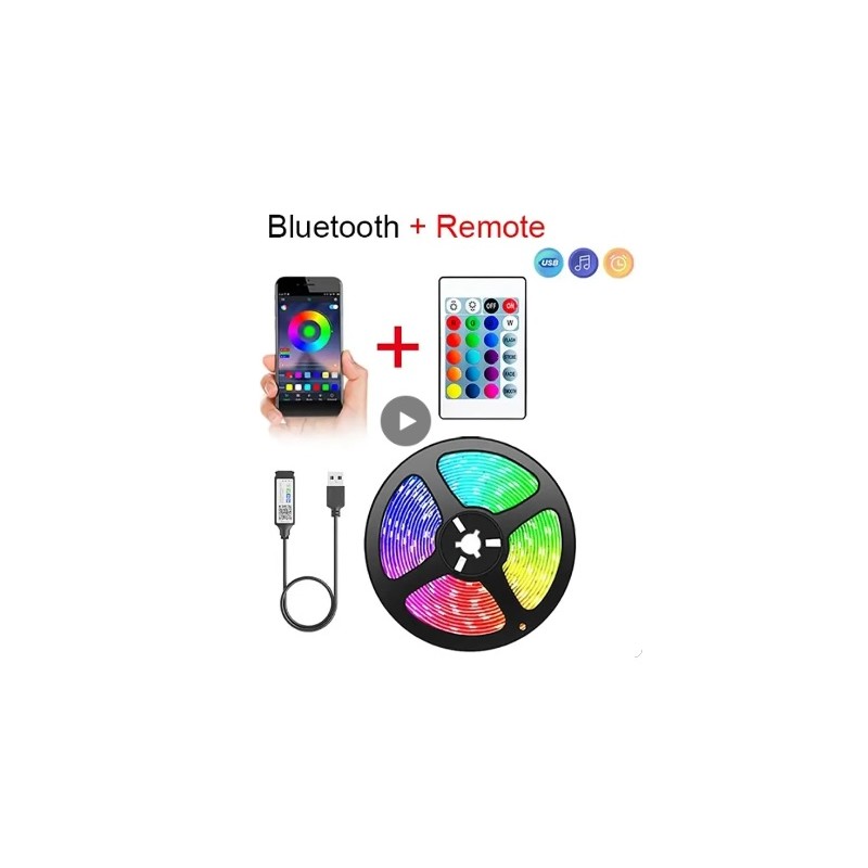Tira de LED RGB de 5 metros USB Bluetooth. Dispone de mando a distancia con 16 colores diferentes y varios efectos de iluminacion distintos. Se puede usar con una APP a traves de bluetooth para ajustar las tonalidades de color y programar varios efectos de iluminacion como flash, funcionar al ritmo de la musica etc. Modelo impermeable valido para interior y exterior. Dispone de cinta adhesiva en la parte trasera para colocarla facilmente. Se puede cortar para ajustarla al tamaño deseado.