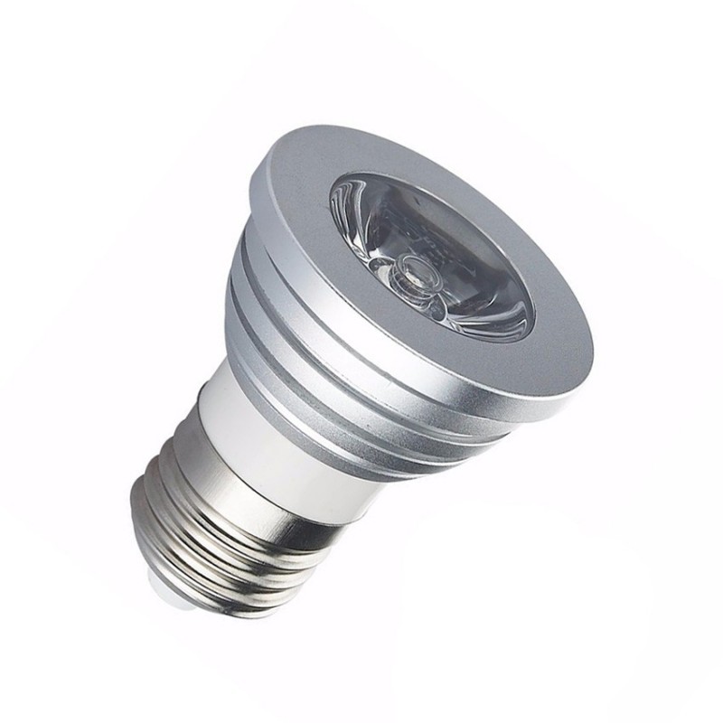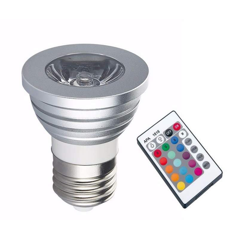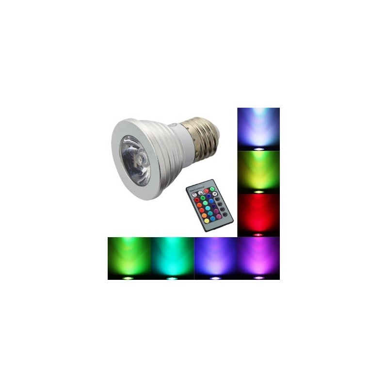 Bombilla de led RGB con mando a distancia multicolor de 16 colores distintos y varias funciones de efectos de luz. Se enchufa a un casquillo de bombilla estandar por lo que es muy fácil de instalar en cualquier lugar. Larga duración 20. 000 horas aproximadamente. Gran luminosidad y bajo consumo. Recomendada para bares, pubs, salas de fiesta, discotecas o uso particular.