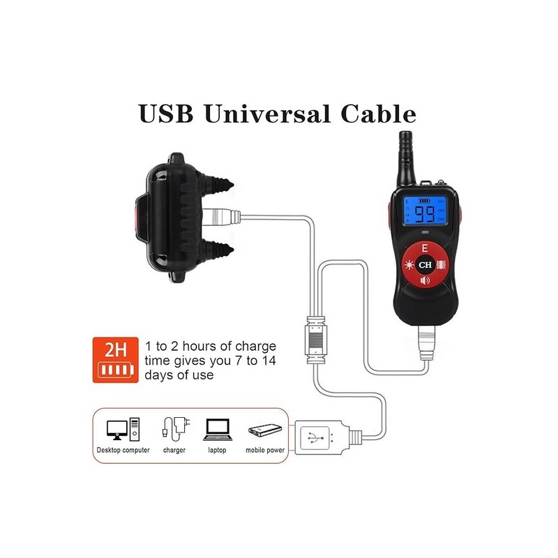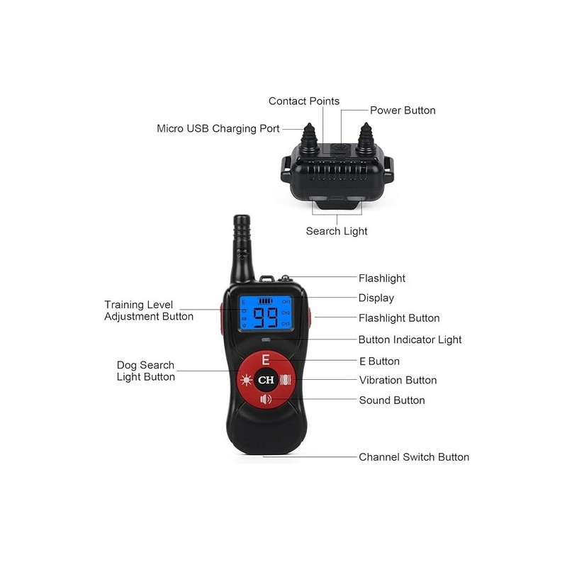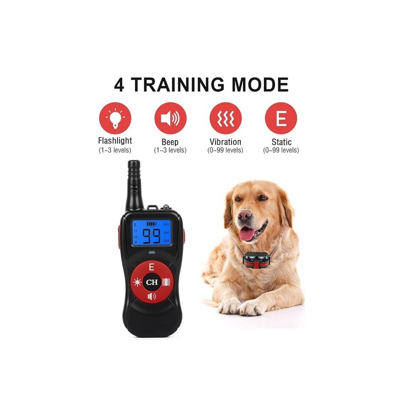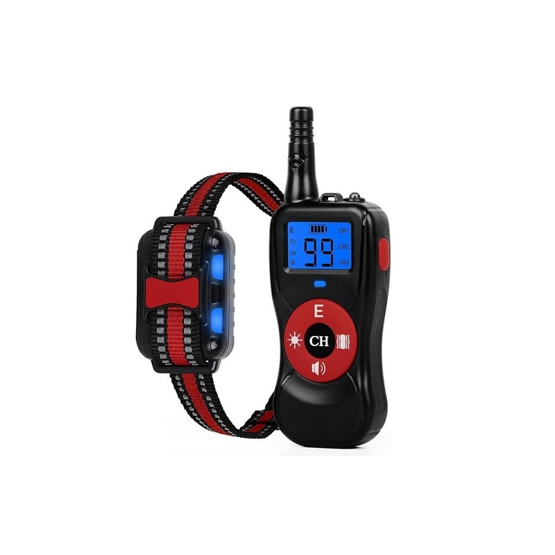 Collar de adiestramiento recargable para perros. Funciona a 800 metros de distancia. Dispone de 3 modos de funcionamiento: descarga electrica, vibracion y sonido. Dispone de 100 niveles para regular la potencia. Collar sumergible. Incorpora linterna. Valido para todas las razas de perros ya que es regulable en tamaño e intensidad. Bateria recargable por USB. Incluye collar de adiestramiento recargable, mando de control con pantalla LCD, accesorios y manual de usuario. Excelente rendimiento.