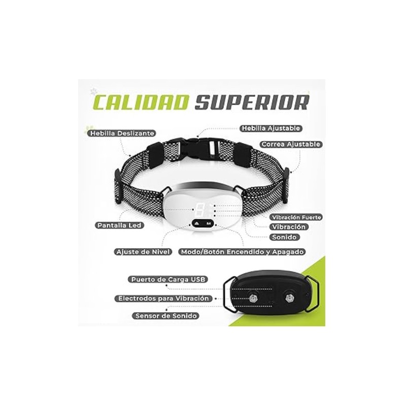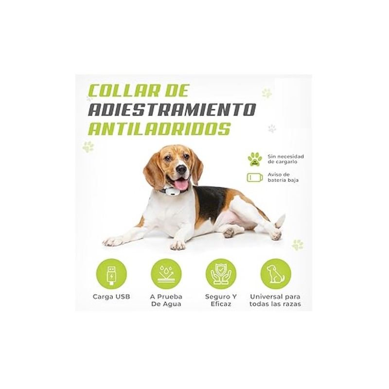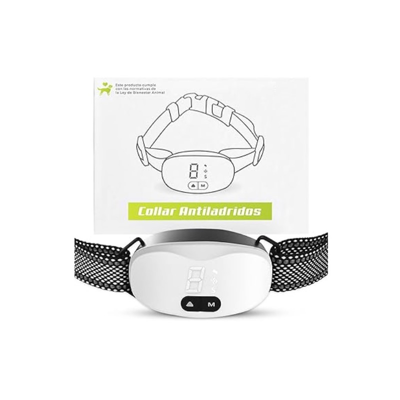 Collar antiladridos para perros valido para todas las razas. Regulable en tamaño e intensidad. Dispone de 8 niveles de intensidad. Tiene 3 modos de uso: descarga electrica, vibracion y sonido. Dispone de bateria recargable por USB de larga autonomia. Modelo sumergible. Recomendado para que su perro deje de ladrar de una forma efectiva y segura sin producirle ningún tipo de daño. Cuando su perro ladra por primera vez el collar lo detecta automaticamente y emite una descarga electrica, aviso sonoro o vibracion a su perro, si el perro continua ladrando el collar aumenta de manera progresiva la intensidad del sonido o vibracion, si el perro deja de ladrar durante 60 segundos el collar vuelve al primer paso. Excelente rendimiento.
