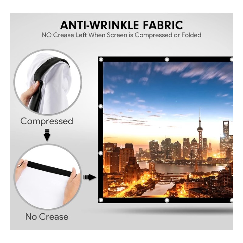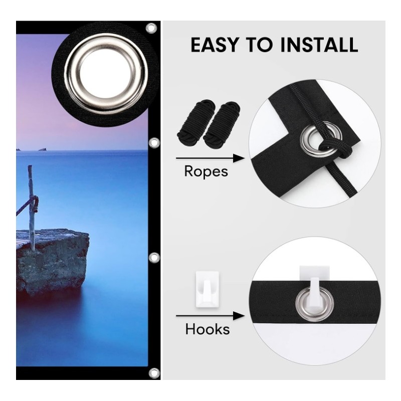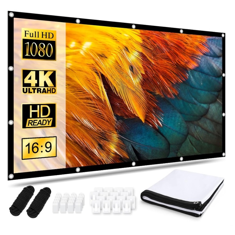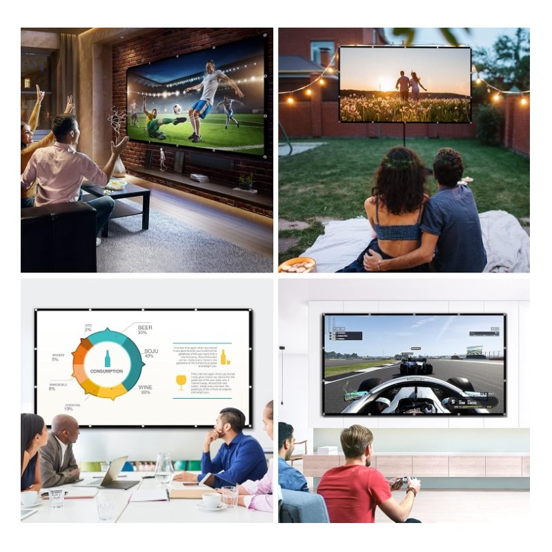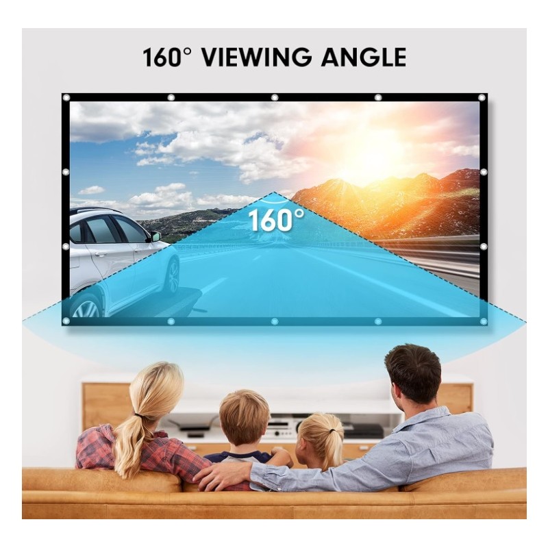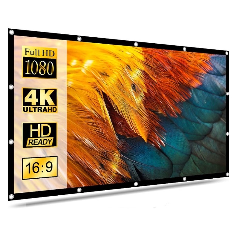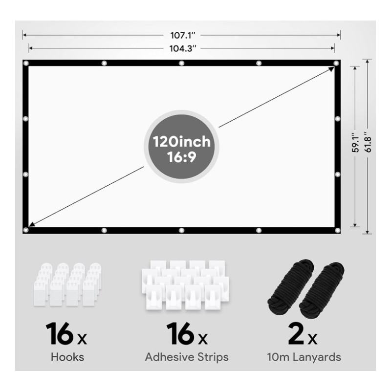 Pantalla de 120 pulgadas para proyector de video. Tiene un formato de 16:9 HD. El tamaño de la pantalla es de 266 x 149 centimetros aproximadamente. Angulo de vision de 160 grados. Pantalla de tela de fibra de poliester antiarrugas, plegable y lavable. Valida para interior y exterior. Pantalla diseñada para brindar una excelente experiencia de cine en casa. Incluye pantalla de 120 pulgadas para proyector de video y los accesorios para colocarla.