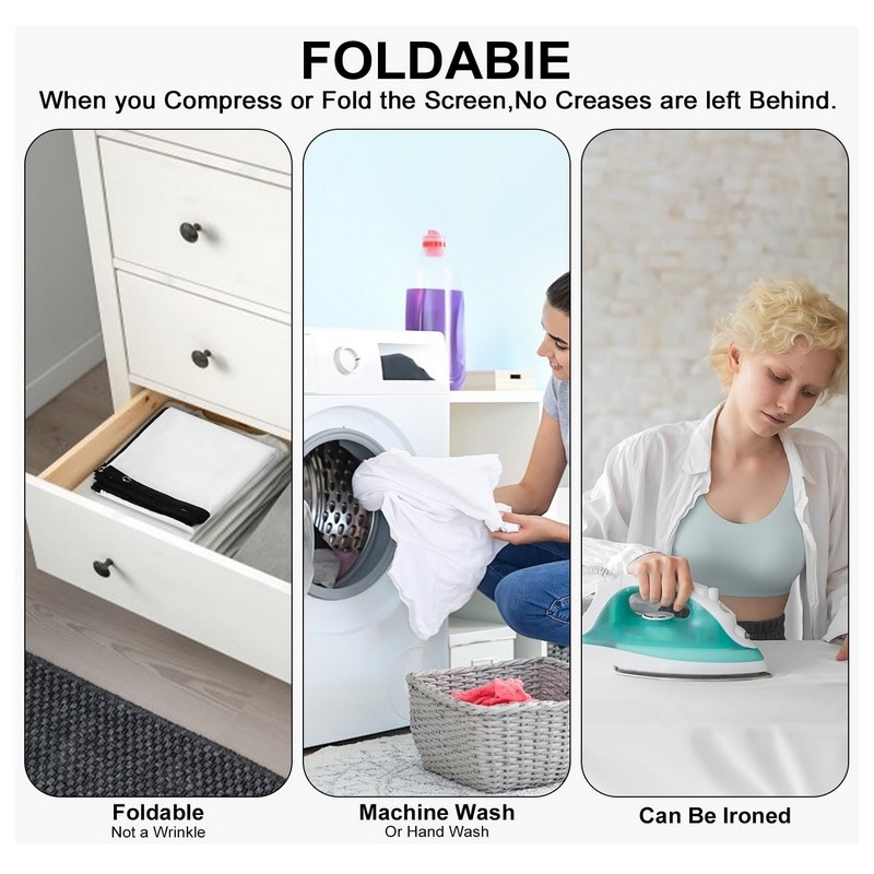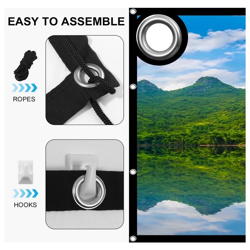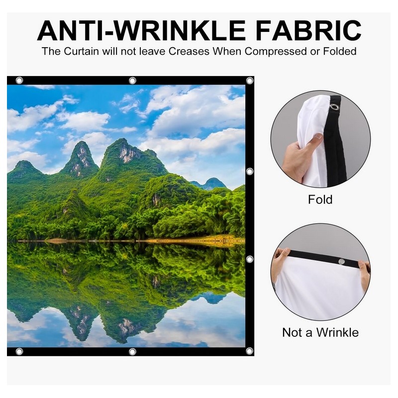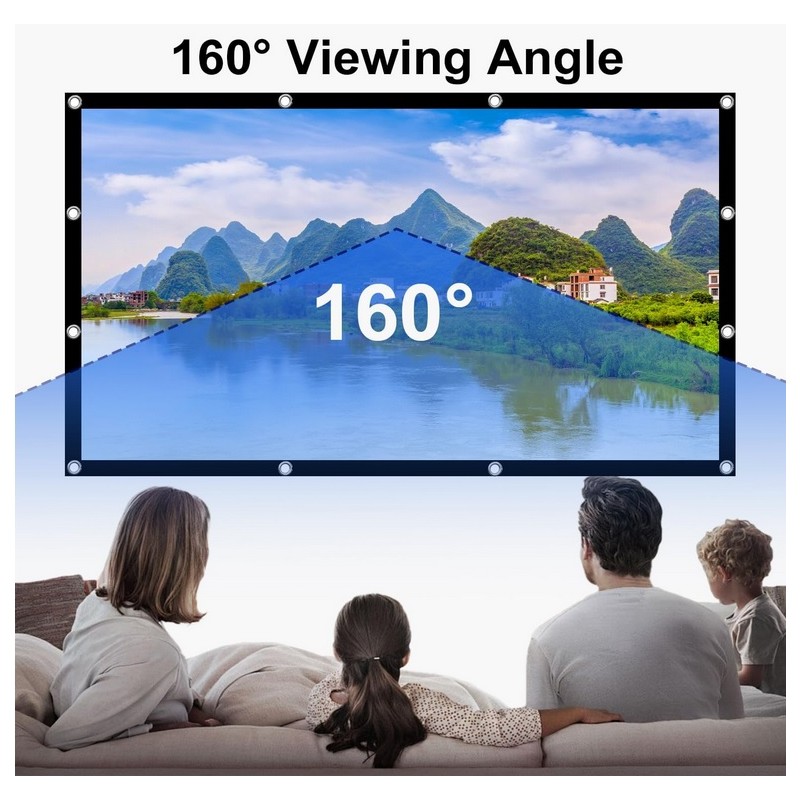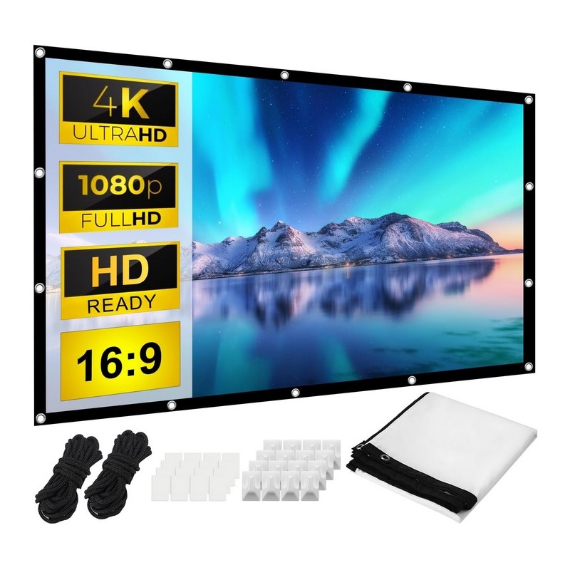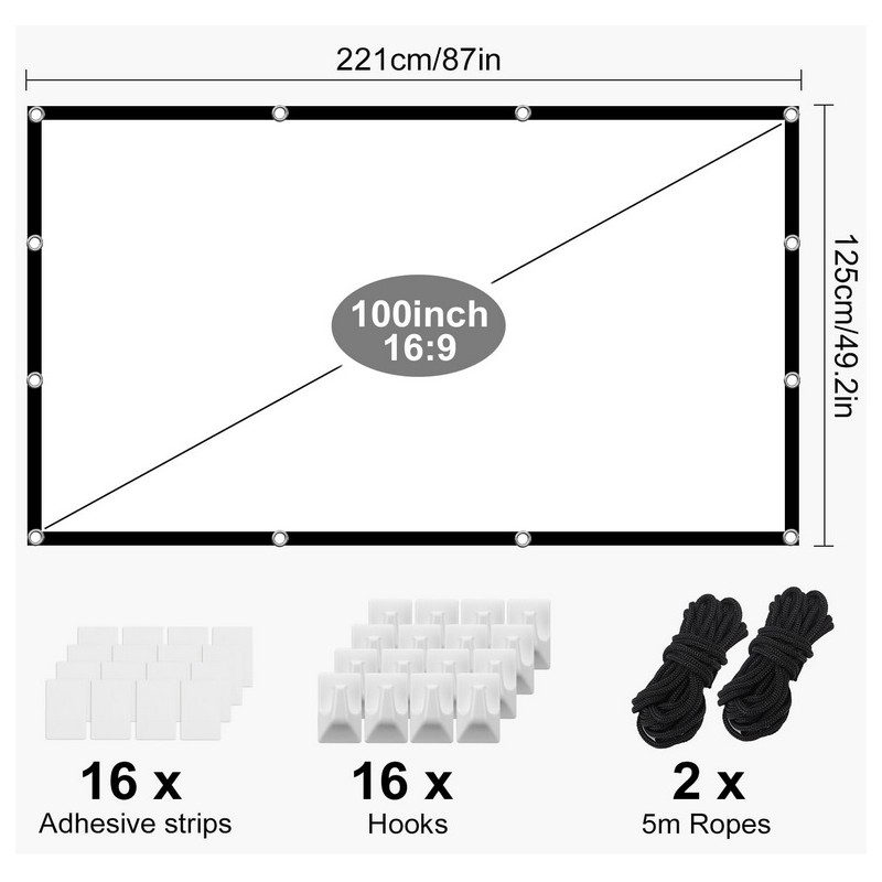 Pantalla de 100 pulgadas para proyector de video. Tiene un formato de 16:9 HD. El tamaño de la pantalla es de 221 x 125 centimetros aproximadamente. Angulo de vision de 160 grados. Pantalla de tela de fibra de poliester antiarrugas, plegable y lavable. Valida para interior y exterior. Pantalla diseñada para brindar una excelente experiencia de cine en casa. Incluye pantalla de 100 pulgadas para proyector de video y los accesorios para colocarla.