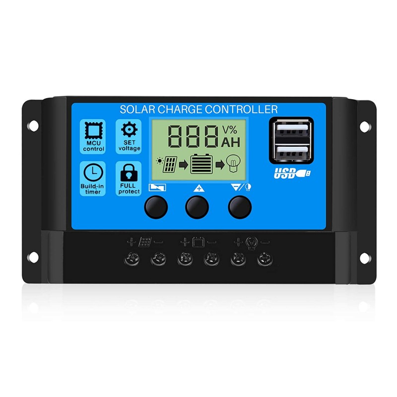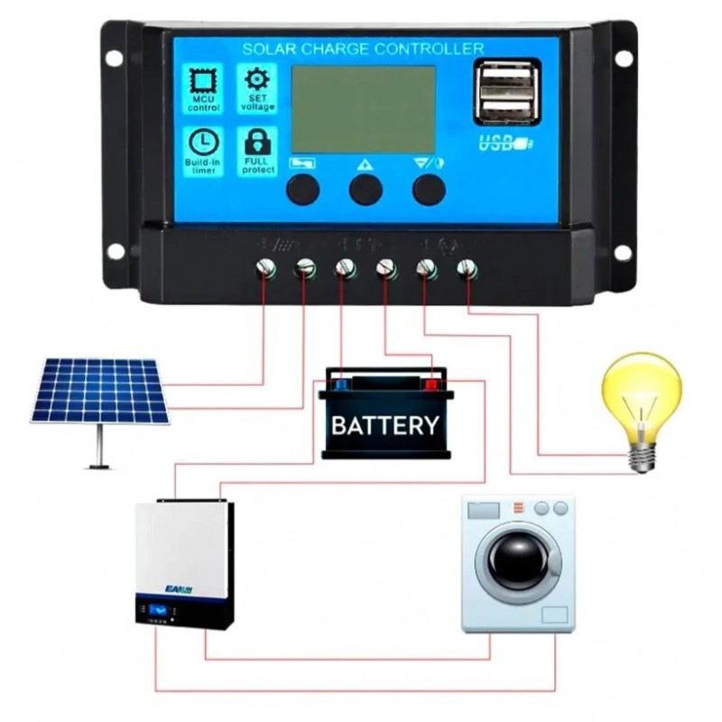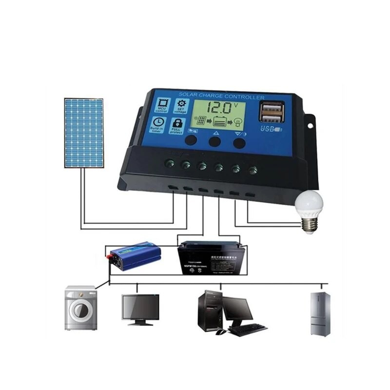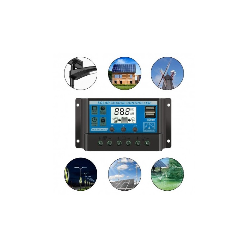 Controlador regulador de carga solar 12v 30A con pantalla LCD. Modelo universal valido para todo tipo de instalaciones de placas solares. Dispositivo inteligente que detecta el voltaje de la instalacion de manera automatica y permite regularlo. Dispone de un sistema de proteccion contra sobrevoltaje y cortocircuitos. Dispone de 2 puertos USB.
