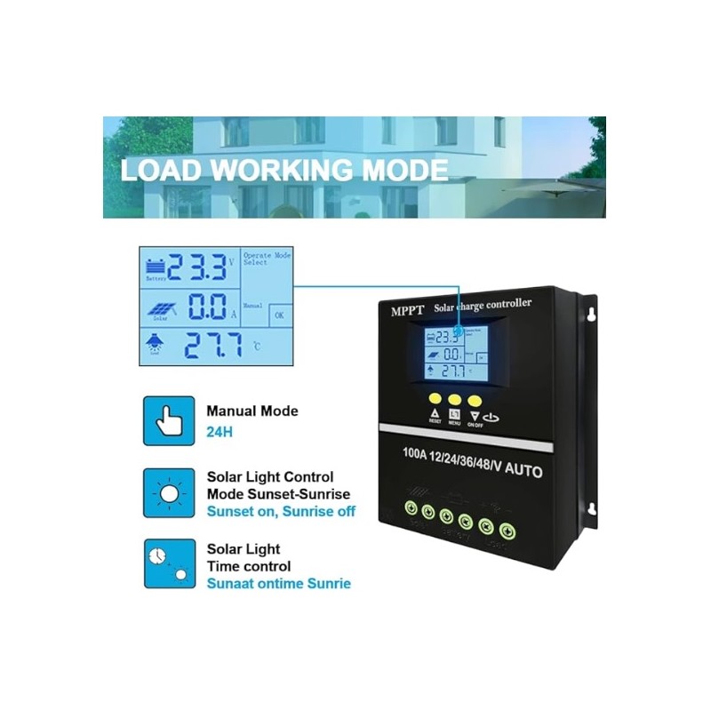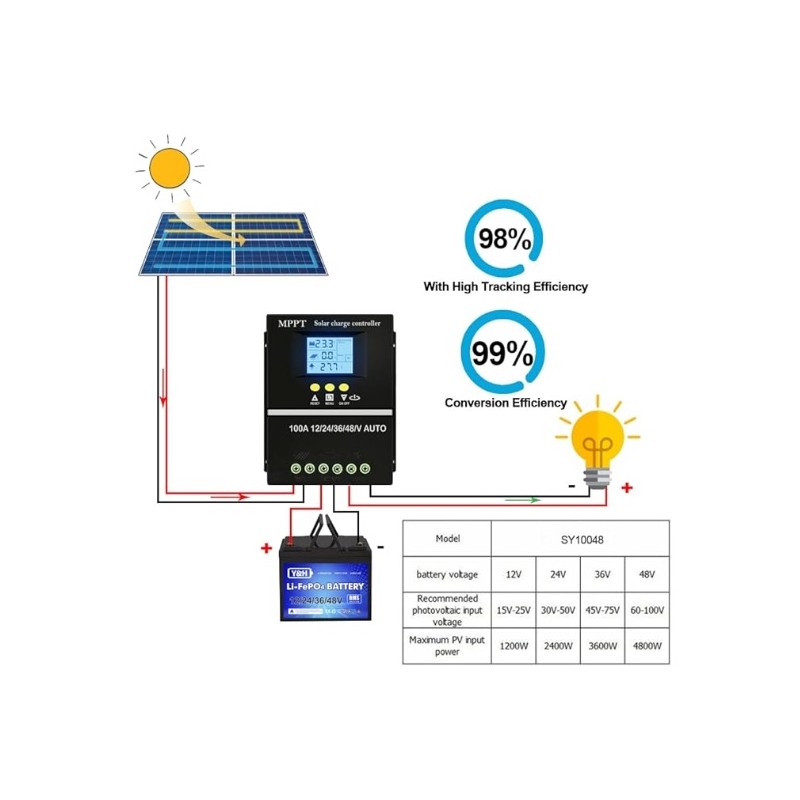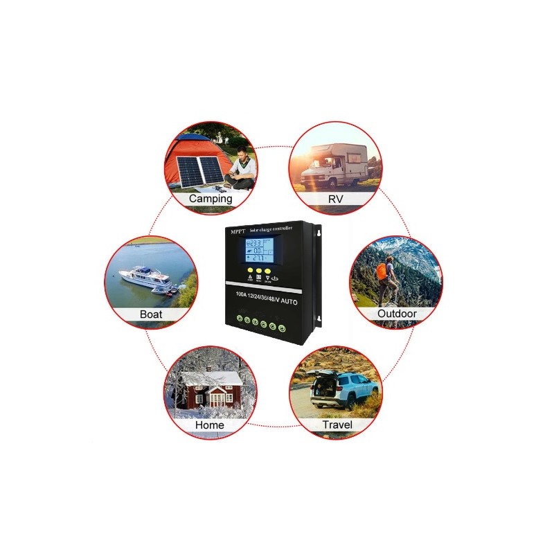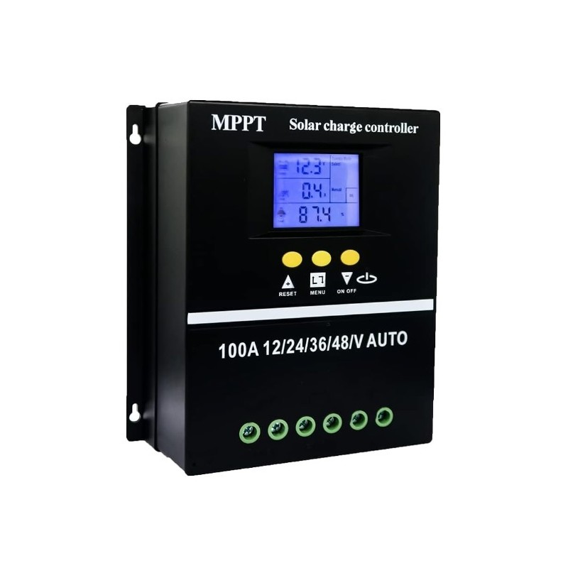 Controlador regulador de carga solar inteligente MPPT de 100A. Valido para todo tipo de instalaciones de placas solares. Compatibilidad de voltaje 12V, 24V, 36V, 48V. Dispositivo inteligente que detecta el voltaje de manera automatica y permite regularlo. Dispone de pantalla LCD retroiluminada que ofrece informacion de la instalacion electrica a tiempo real. Incorpora 2 puertos USB. Compatible con distintos tipos de baterias. Proteccion contra subidas de tension y altas temperaturas.