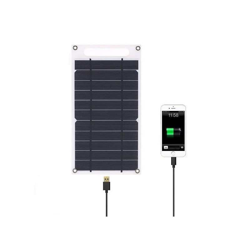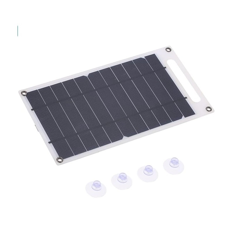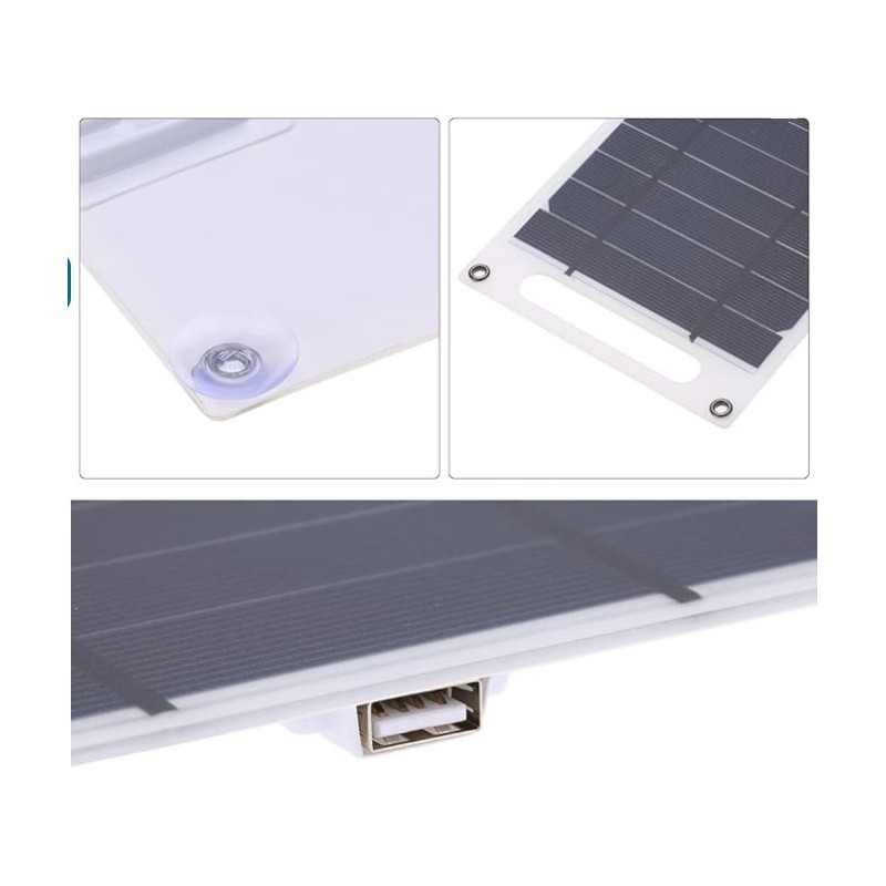 Placa solar panel monocristalino de 10w. Dispone de puerto USB para cargar el telefono movil, tablet, camaras, powerbank o cualquier otro dispositivo que admita carga a traves de puerto USB. Modelo resistente al agua con proteccion IP65. Medidas 26cm x 14cm x 0,2cm aproximadamente. Peso 127 gramos aproximadamente. Dispone de 4 ventosas para fijarlo facilmente a cualquier superficie plana. Recomentado para senderismo, acampadas, deportes al aire libre, etc. Incluye placa solar con puerto USB y 4 ventosas.
