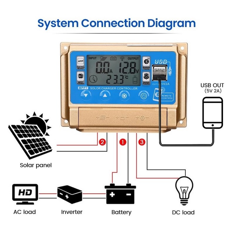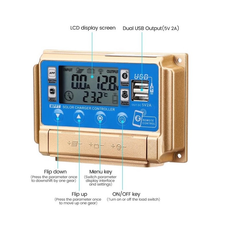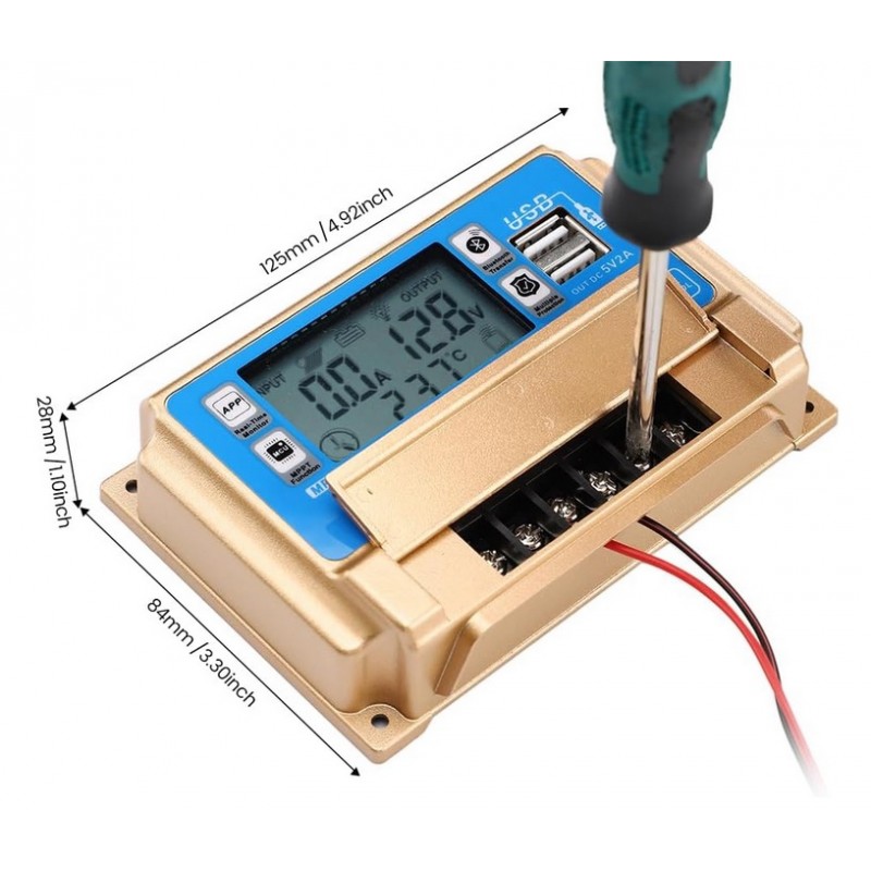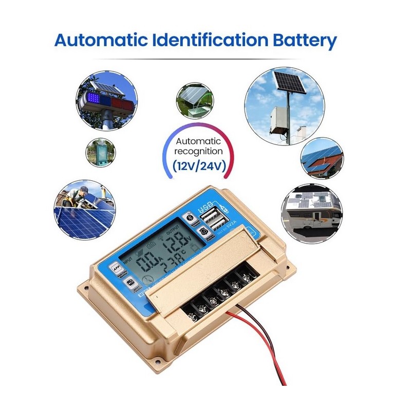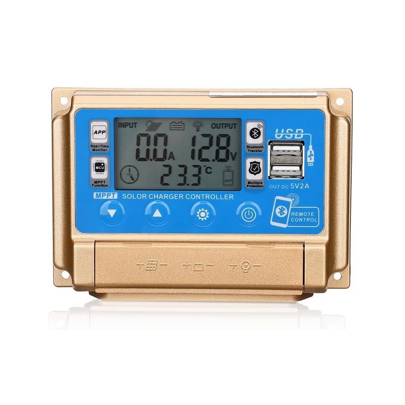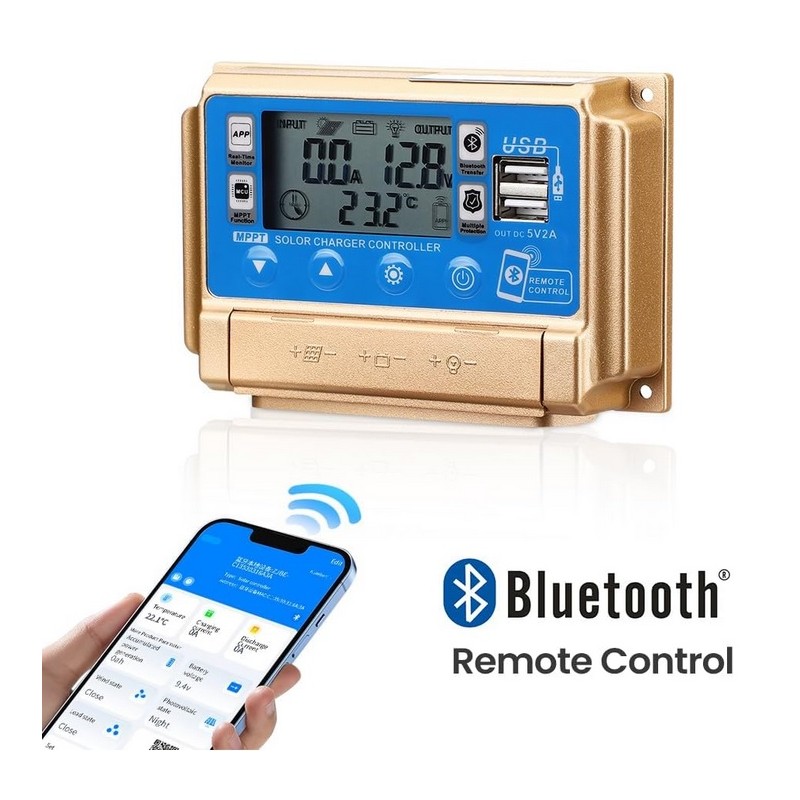 Controlador regulador de carga solar 12v/24v 30A con pantalla LCD. Modelo universal valido para todo tipo de instalaciones de placas solares. Dispositivo inteligente que detecta el voltaje de la instalacion de manera automatica y permite regularlo. Dispone de conectividad por Bluetooth para poder monitorizar los parametros de informacion del regulador a traves de una APP. Sistema de proteccion contra sobrevoltaje y cortocircuitos. Dispone de 2 puertos USB.