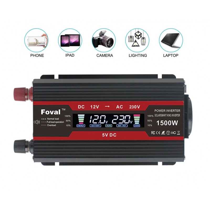 Transformador convertidor de corriente de 12v a 220v con una potencia de salida de 1500w. Permite convertir la corriente electrica continua (12v) a corriente electrica alterna (220v). Modelo de convertidor electrico valido para placas solares y para tener en su vehiculo un enchufe tipo pared como los de casa para conectar cargadores, ventilador, television, nevera o cualquier otro dispositivo electronico con enchufe. Funciona con cualquier tipo de placa solar y con cualquier vehiculo que funcione a 12v. Incluye convertidor de corriente, cable de pinzas de bateria y conector de mechero.