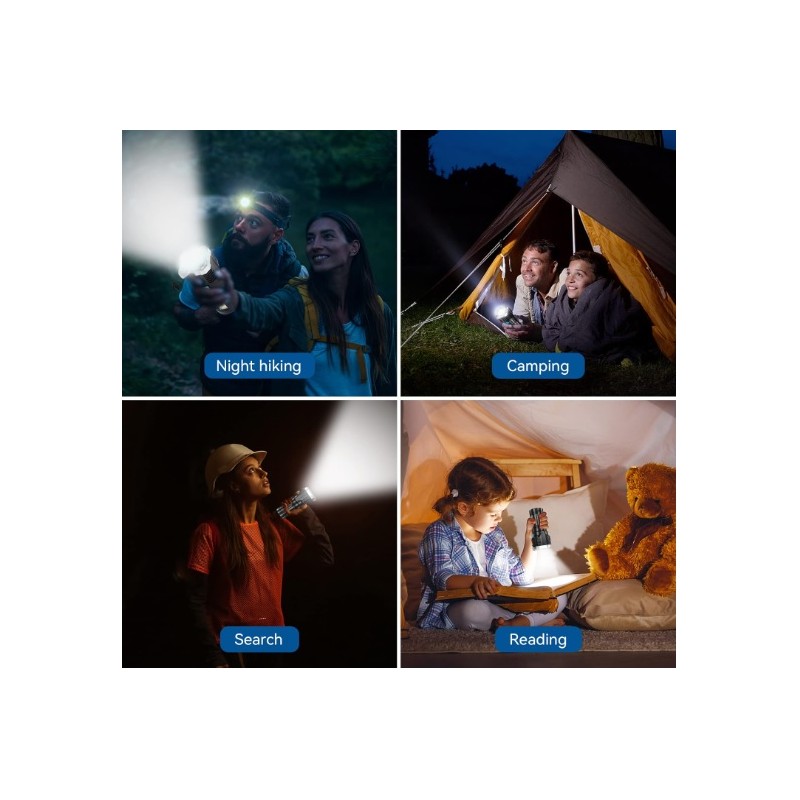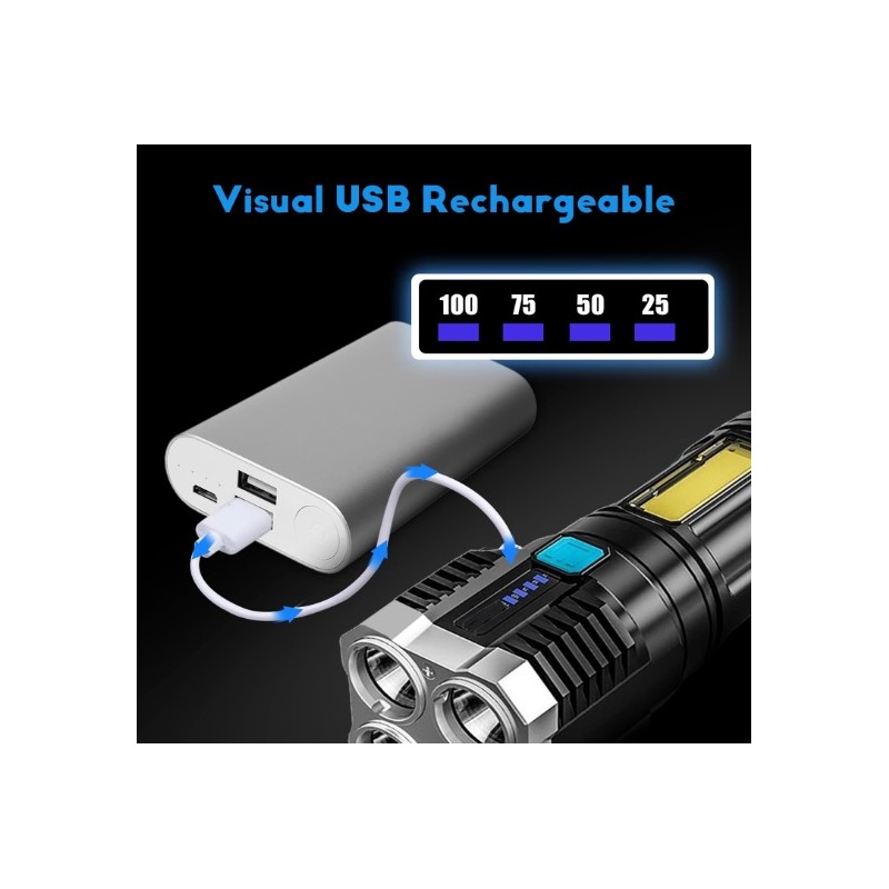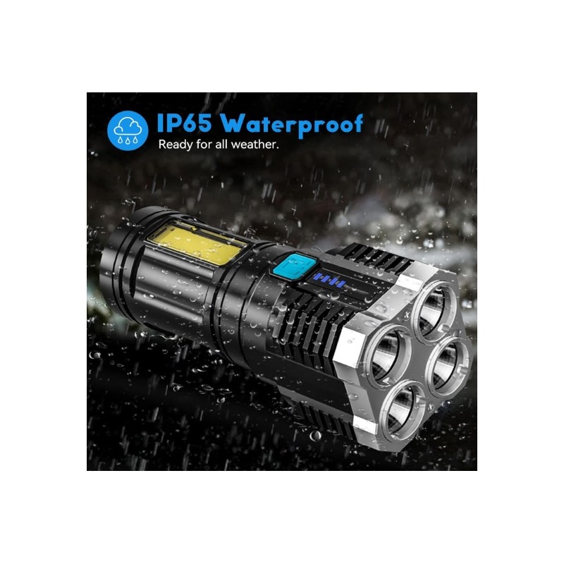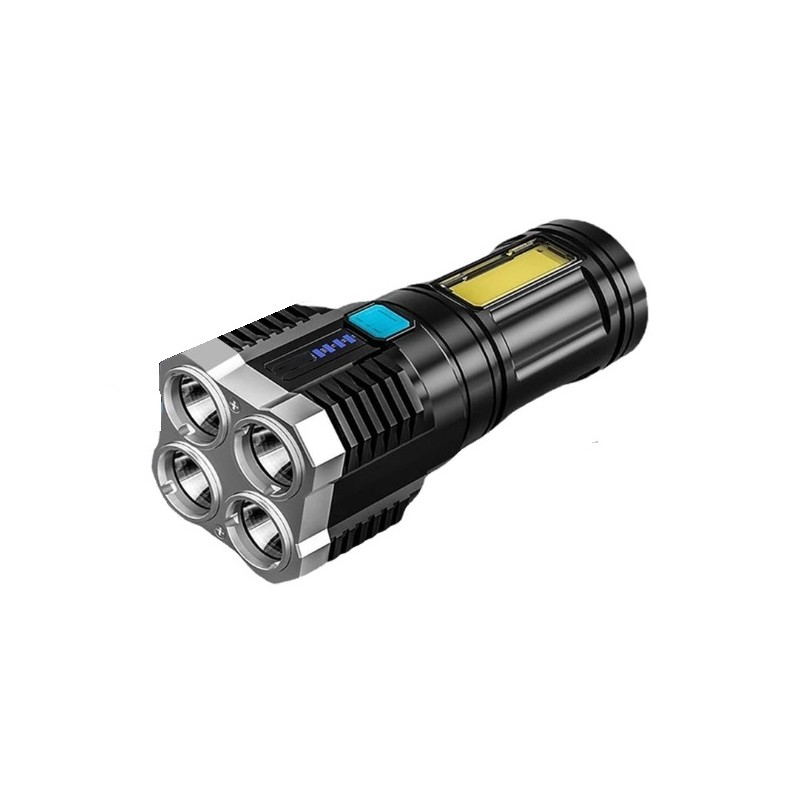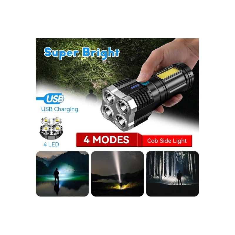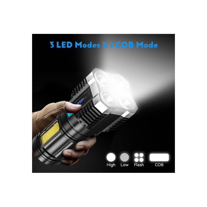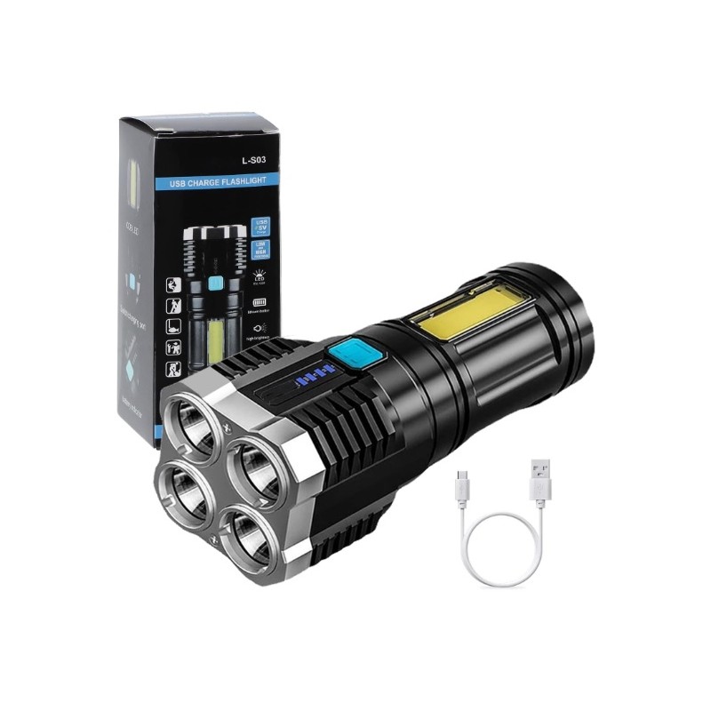 Linterna de mano con 4 focos LED de gran potencia. Bateria de larga autonomia recargable por USB. Dispone de 4 modos de iluminacion diferentes para adaptarlo a las necesidades de cada situacion. Dispone de luces laterales COB que se pueden utilizar como luces de mantenimiento, de trabajo o de emergencia, etc. Modelo impermeable resistente al agua. Recomendada para senderismo, pesca, rondas de vigilancia o cualquier tipo de actividad al aire libre. Incluye linterna LED y cable USB.