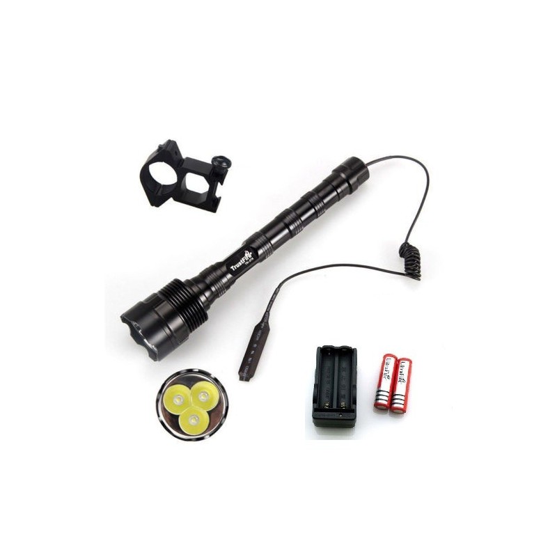 Linterna profesional de led con una potencia extraordinaria de 3800 lumenes, incorpora 3 LED de gran potencia. Material en aluminio. Incluye linterna LED de 3800 lumenes, 2 baterías recargables ultrafire de 4000 miliamperios, cargador de pared, soporte de montura para rifle y pulsador remoto. Pack recomendado para caza.Resistente al agua. Considerada por los expertos una de las mejores linternas del momento. Excelente calidad y diseño.