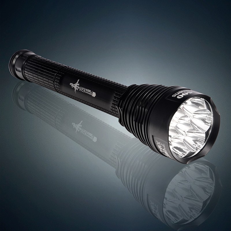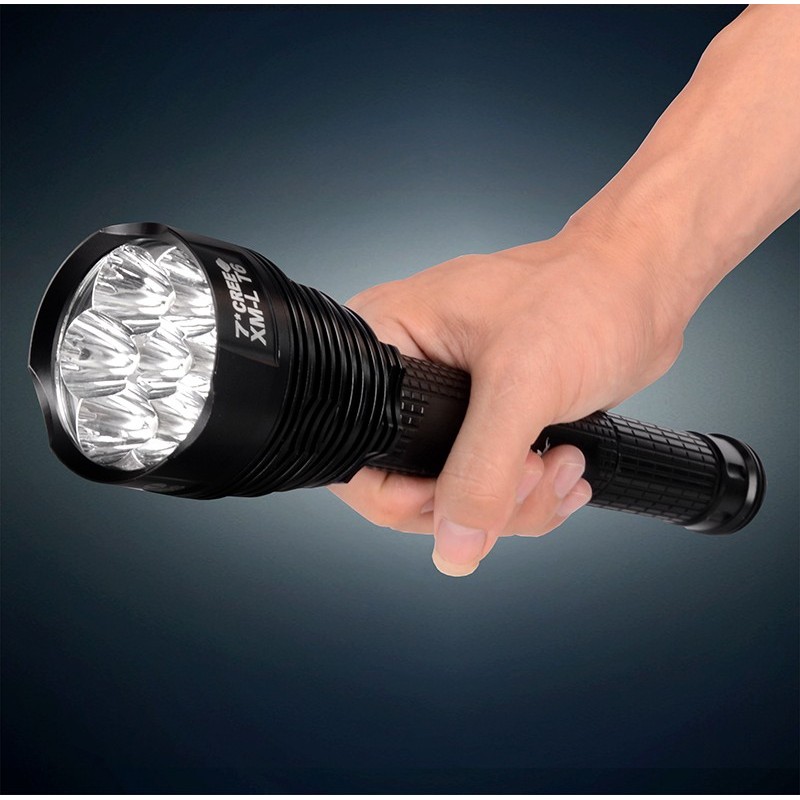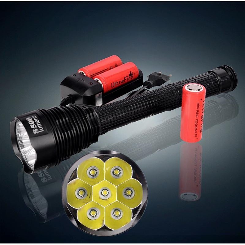 Linterna profesional de LED con una potencia de 8500 lumenes, incorpora 7 LED de gran potencia. Material en aluminio. Incluye linterna LED de 8500 lumenes, 2 baterías recargables ultrafire de 4000 miliamperios, cargador de pared y funda. Resistente al agua. Considerada por los expertos una de las mejores linternas del momento. Recomendada para caza, rondas de vigilancia, etc. Excelente calidad y diseño.