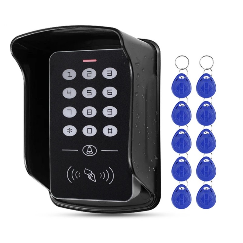 Teclado de control de acceso digital. Frecuencia de trabajo 125KHz con una capacidad maxima de hasta 1000 tarjetas de usuario. Dispone de 3 metodos de acceso diferentes: acceso con contraseña, acceso con tarjeta RFID o acceso con contraseña + tarjeta RFID. Dispone de carcasa protectora de lluvia para colocarlo en el exterior. Funciona con un voltaje de 12v. Funciona solo sin necesidad de conectarlo a un ordenador. Incluye panel de control de acceso digital, carcasa protectora, 10 llaveros de usuario RFID y manual de usuario.