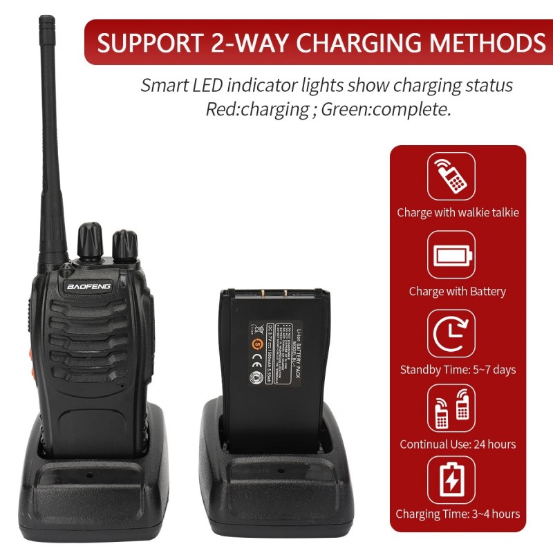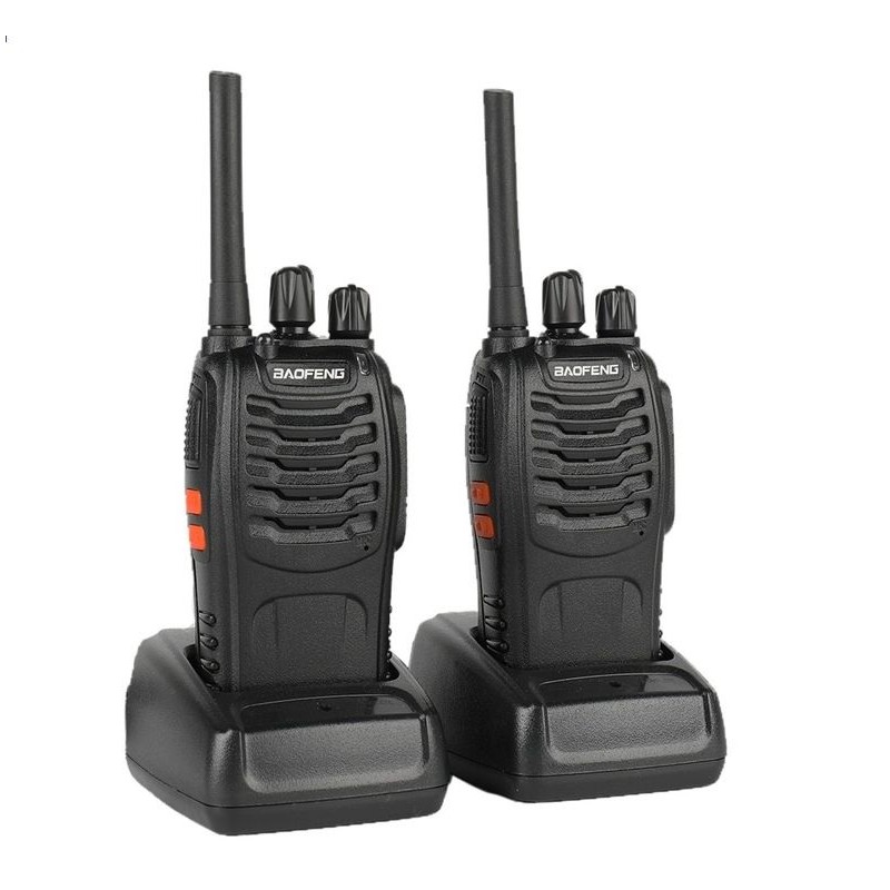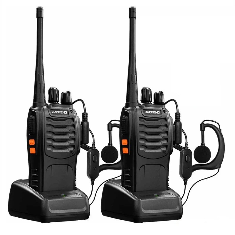 Pack de 2 walkie talkie profesional de larga distancia. Dispone de 16 canales de frecuencia diferentes. Distancia de funcionamiento de hasta 5 Kilometros aproximadamente. Boton de emergencia incorporado y linterna LED.Función DCS y CTCSS para bloquear la señal de interferencia externa y reducir el ruido. Bateria de 1500mAh recargable de gran autonomia. Funcion de manos libres para poder hablar sin necesidad de pulsar la tecla PTT. Material resistente que aguanta caidas, salpicaduras, climas adversos, etc. Recomendado para actividades al aire libre, rondas de vigilancia, discotecas, etc. Incluye 2 walkie talkies, 2 baterías de iones de litio, 2 cargadores, 2 auriculares, 2 clips para cinturón, 2 correas de mano, y manual de usuario.