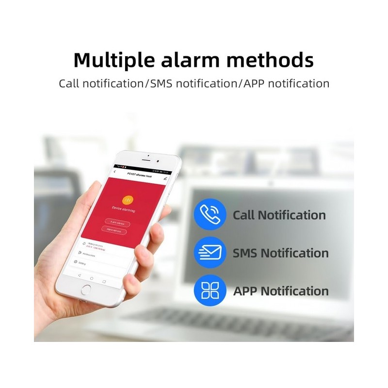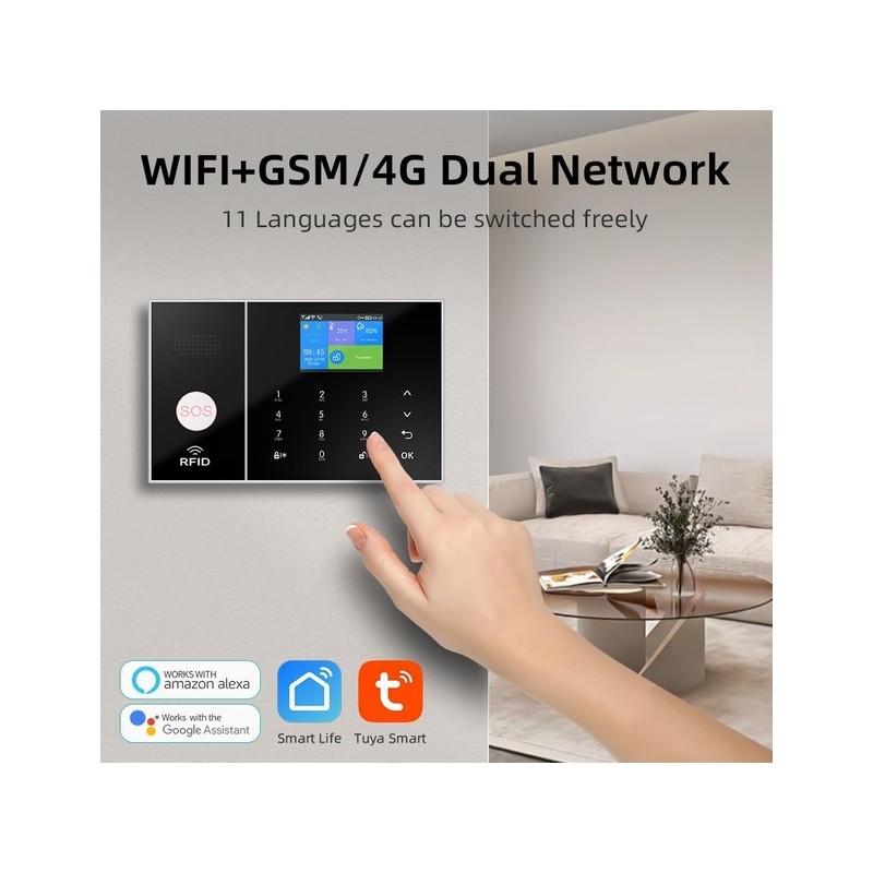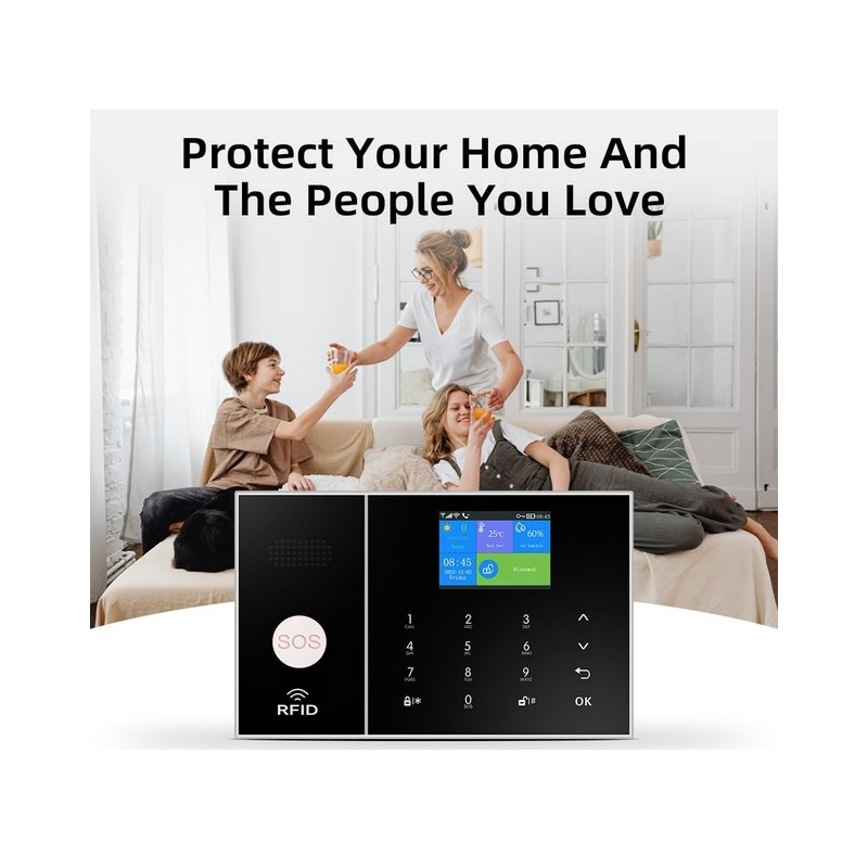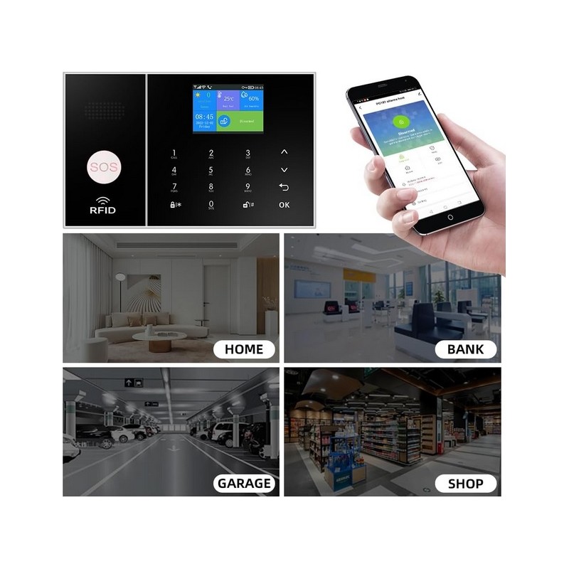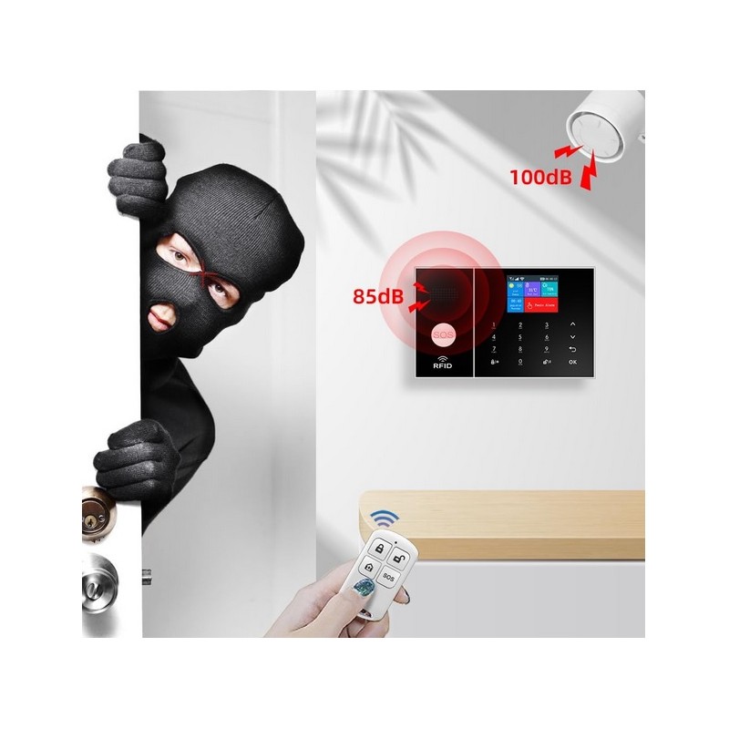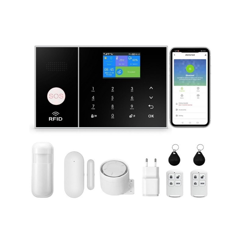 Sistema de alarma inalambrico Wifi GSM 4G con APP. Sistema compuesto por alarma con sirena, detectores de movimiento, sensores de puertas/ventanas y mandos a distancia. Compatible con tarjeta SIM telefonica. Funciona con una APP movil compatible con Iphone y Android desde la que puede activar y desactivar la alarma de forma remota y recibir notificaciones de aviso de robo entre otras funciones. Sistema de alarma compatible con 2G/3G/4G. Funciona con Alexa y Google Assistant para uso mediante voz. Notificaciones de robo por APP, SMS o llamada telefonica. Sistema de alarma inalambrico sin necesidad de cableado.
