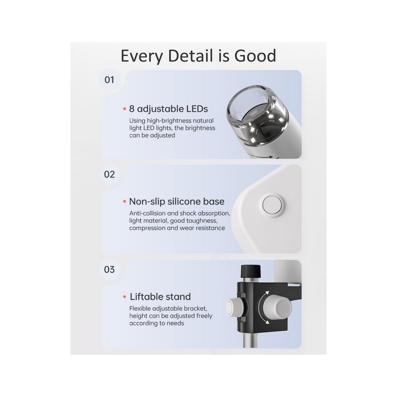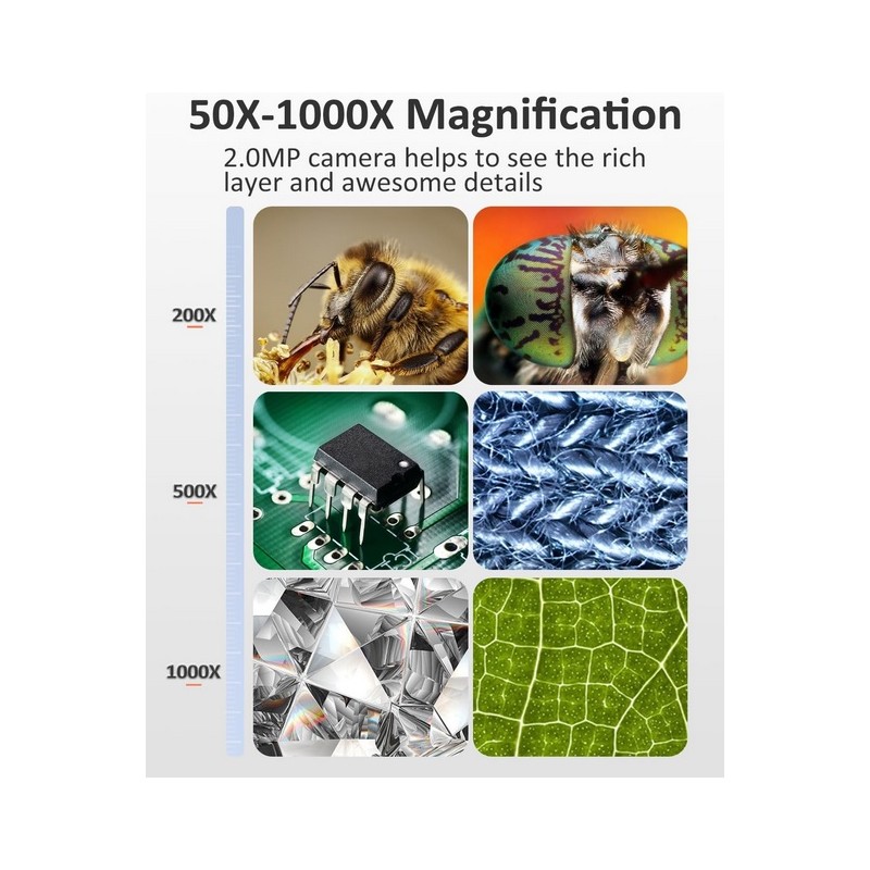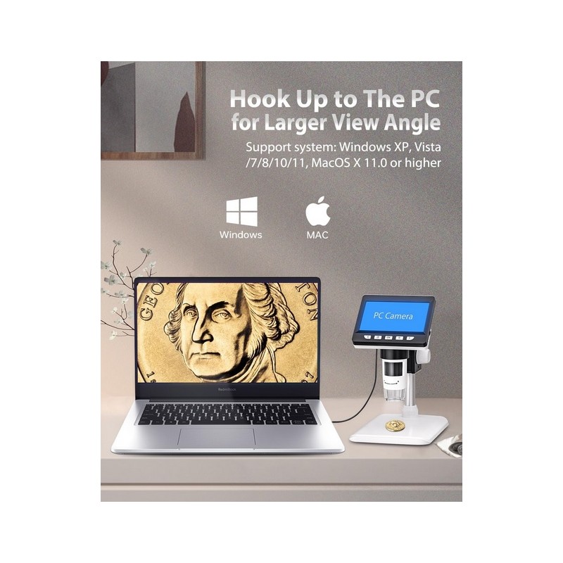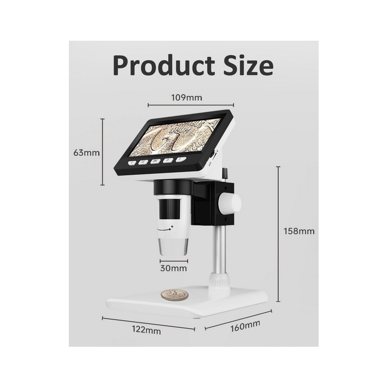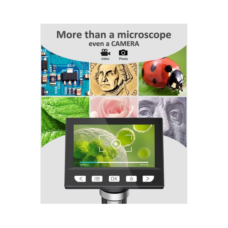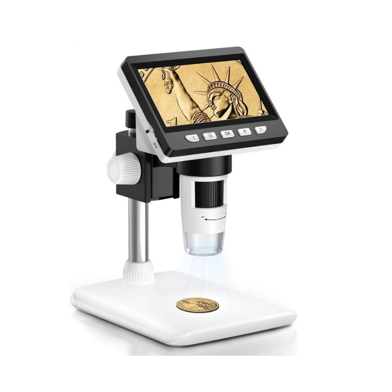 Microscopio digital electronico portatil profesional. Microscopio profesional le permite acercar y alejar para ver detalles increíbles en un rango de aumento de 50-1000X. Dispone de pantalla IPS HD de 4,3 pulgadas con imagen digital 1920x1080p. Tiene 8 luces LEDs para ajustar la iluminacion. Vista desde ordenador con imagen a tiempo real para realizar fotos y videos. Compatible con Windows y MacOS. Batería recargable de 2000 mAh. Compatible con tarjetas de memoria.