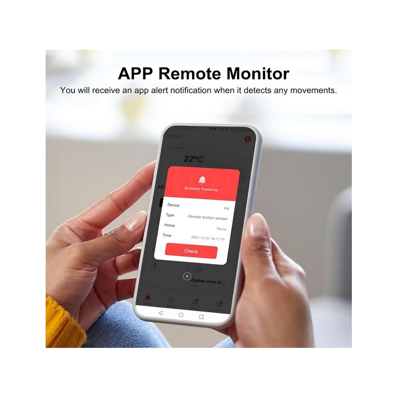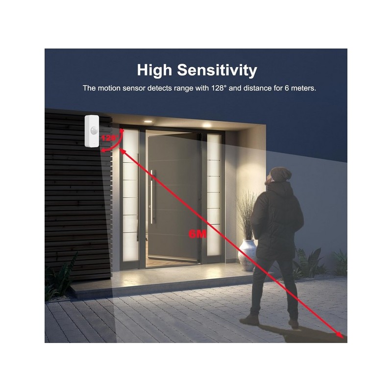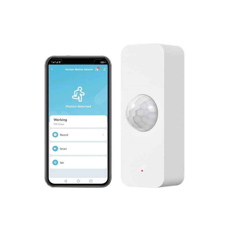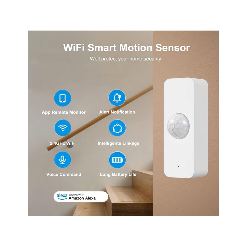 Sensor de movimiento Wifi con APP. Este sensor cuando detecta movimiento envia notificaciones de alerta a su telefono movil a traves de una APP gratuita compatible con Iphone y Android. Conectividad Wifi sin necesidad de cables. Rango de deteccion 128 grados. Distancia de deteccion 6 metros. Compatible con Alexa para comandos de voz y control de dispositivos inteligentes.