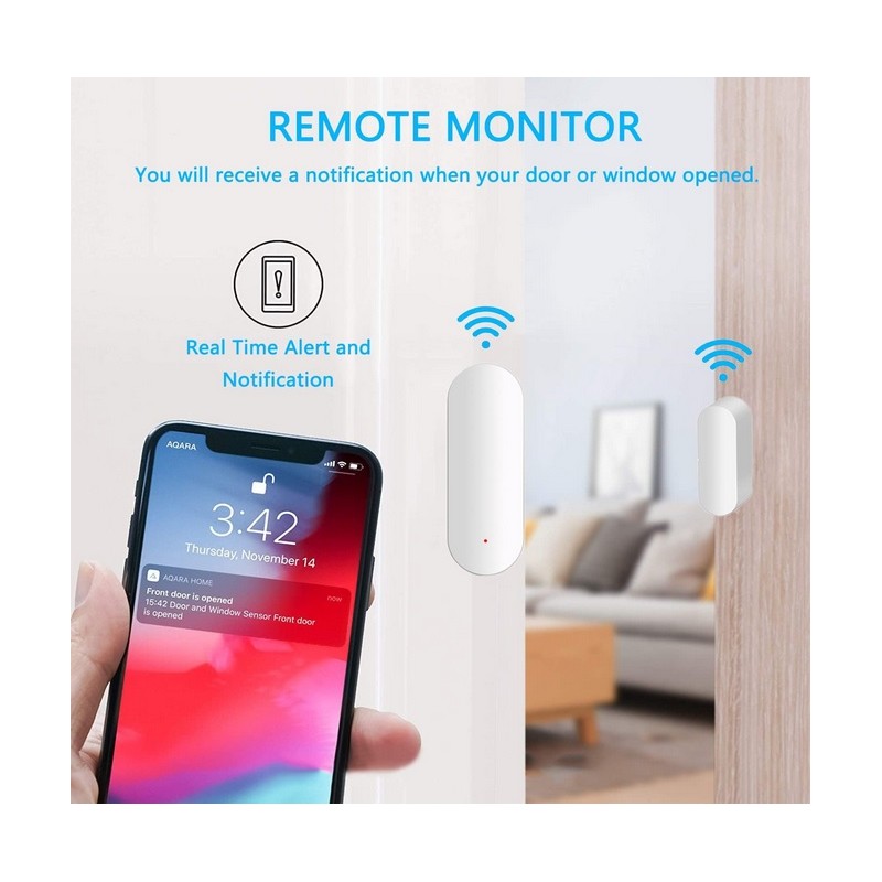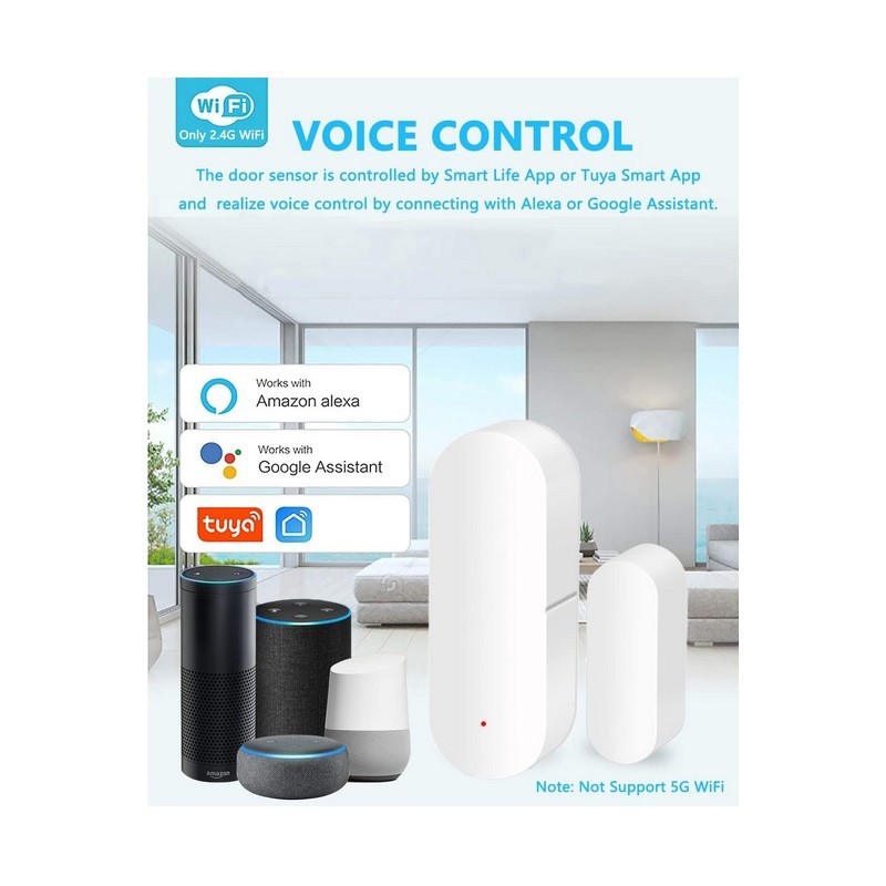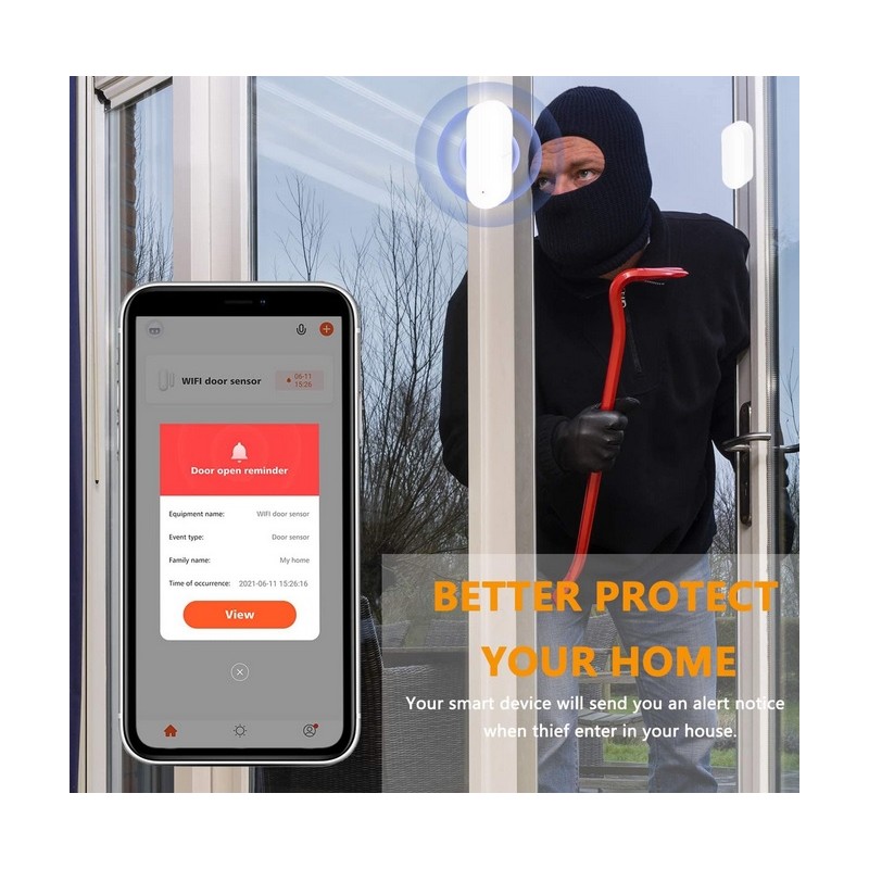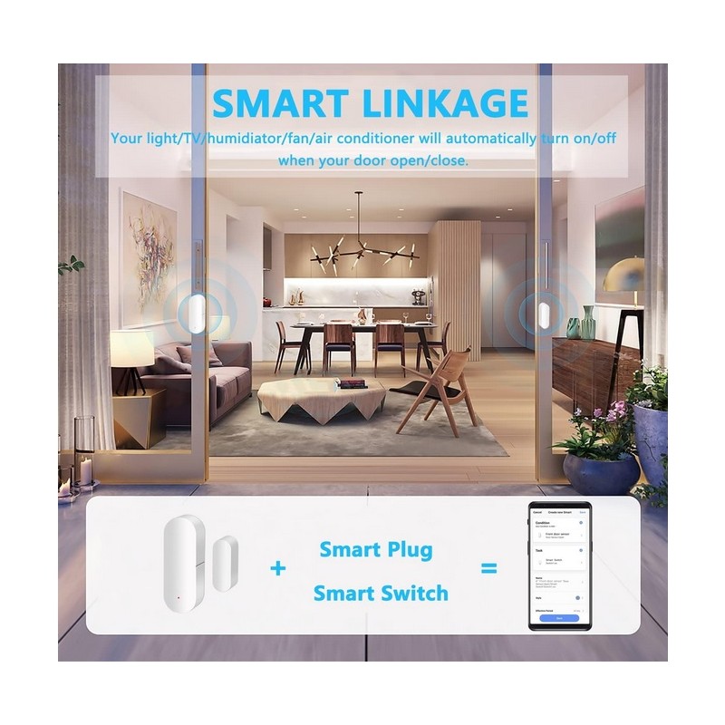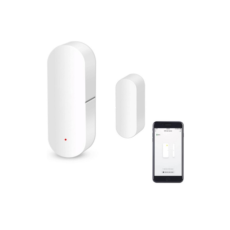 Sensor de puertas y ventanas Wifi con APP. Este sensor cuando se abre una puerta o ventana y envia notificaciones de alerta a su telefono movil a traves de una APP gratuita compatible con Iphone y Android. Conectividad Wifi sin necesidad de cables. Compatible con Alexa y Google Assistant para comandos de voz y control de dispositivos inteligentes. Incluye cinta adhesiva para la instalacion.