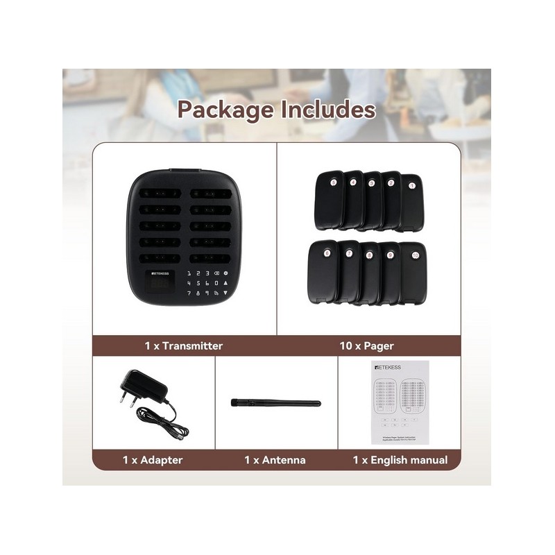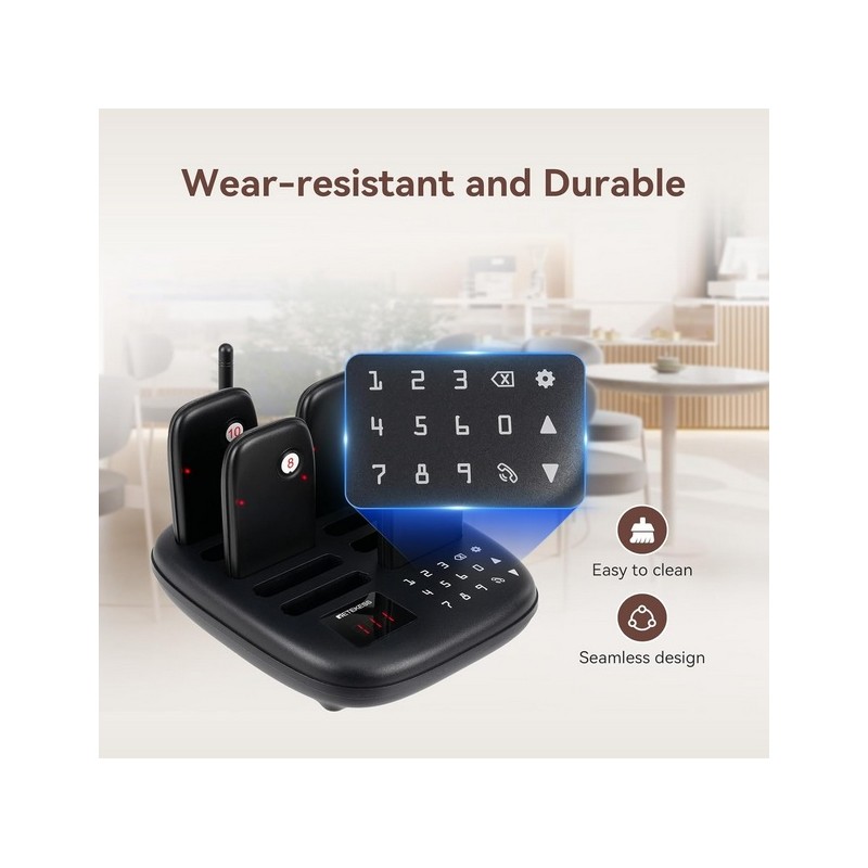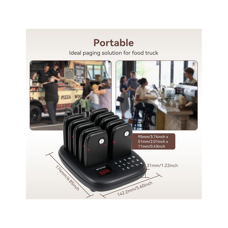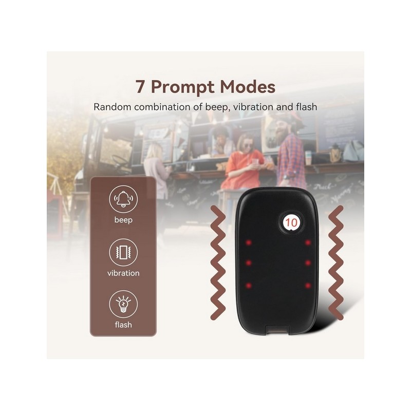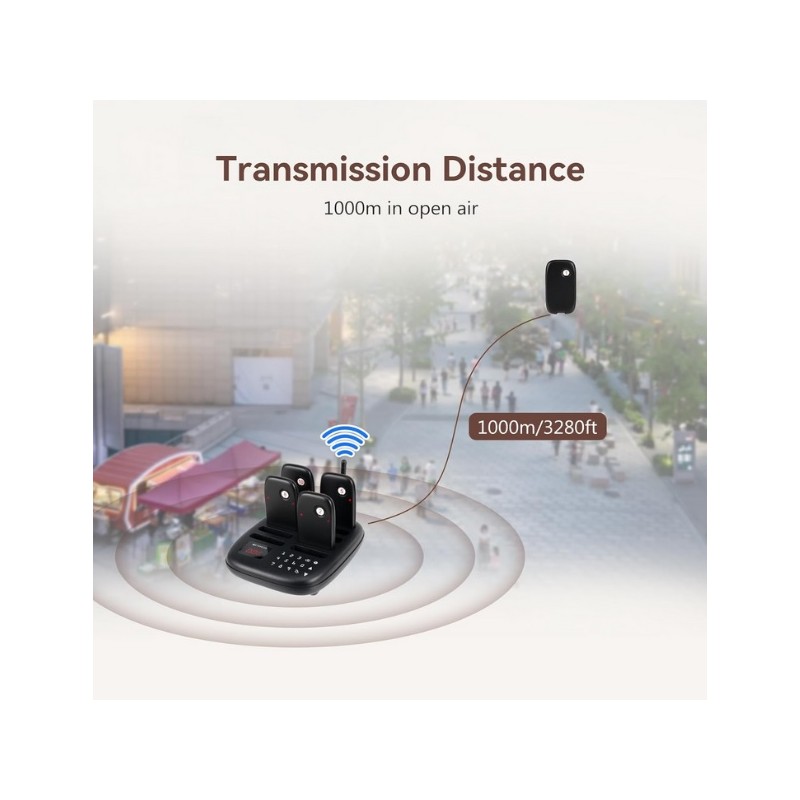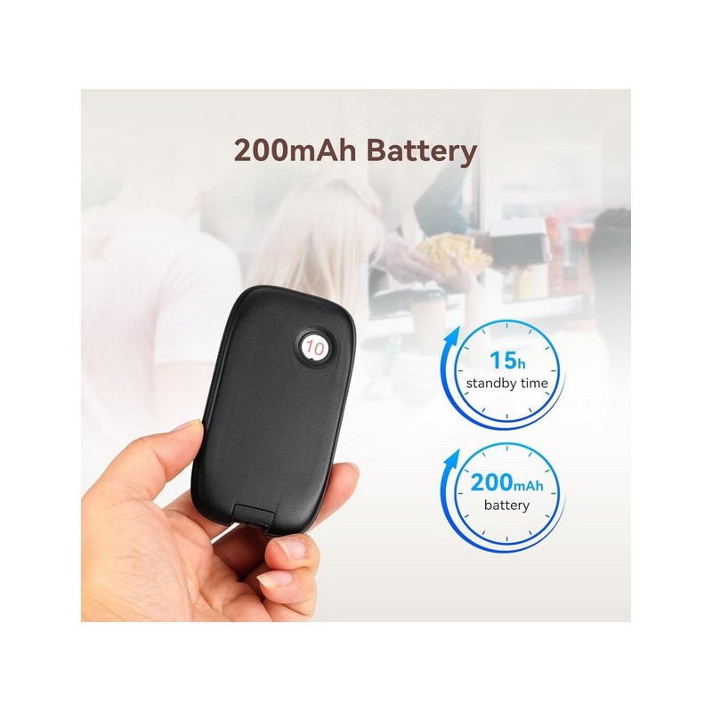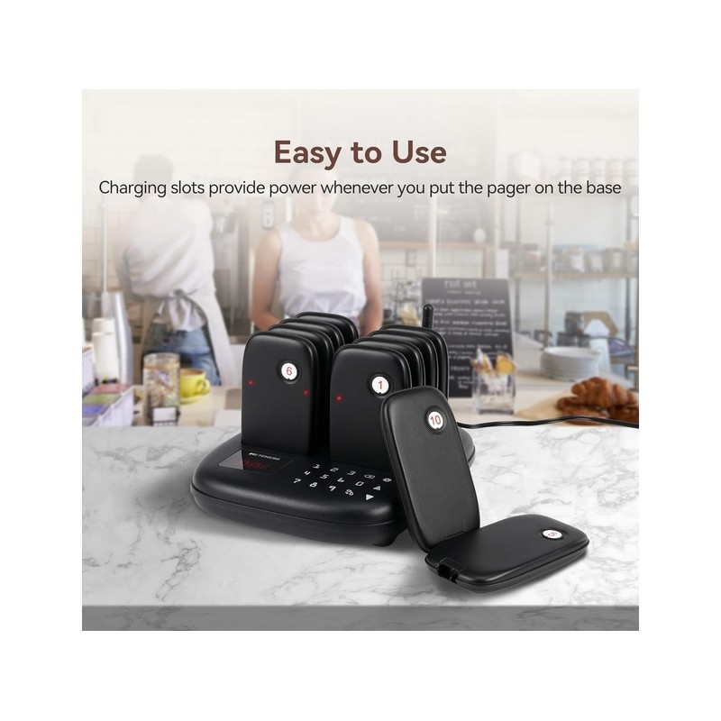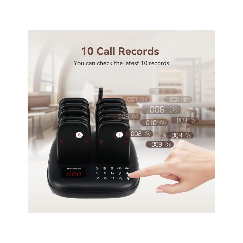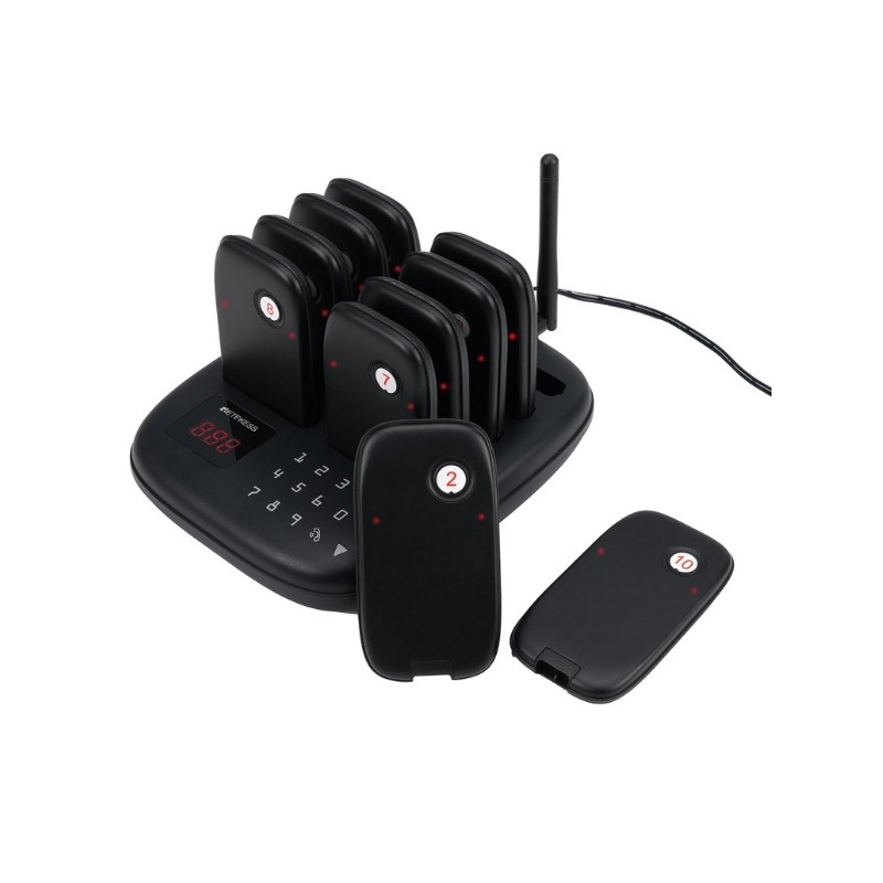 Buscapersonas avisador inalambrico para bares y restaurantes. Dispone de una centralita de llamadas con teclado tactil y base de carga. Tiene 10 Bipers con rango inalambrico de 100 a 300 metros en interior y hasta 1000 metros en exterior y una bateria recargable de 200 mAh con una autonomia de 15 horas aproximadamente. Dispone de 7 modos de llamada vibracion, pitido y flash combinables segun las necesidades. Se puede consultar el historial de llamadas. Posibilidad de ampliar hasta un maximo de 998 Bipers. Facil de usar.