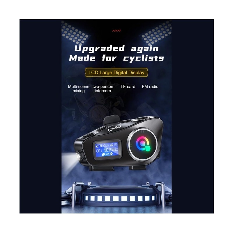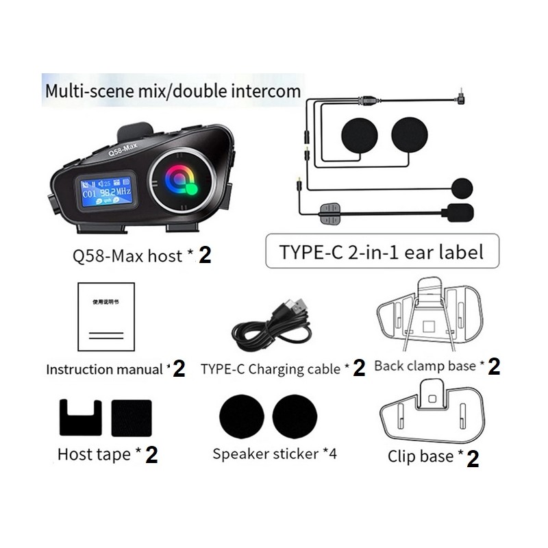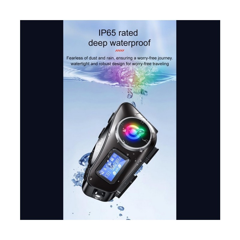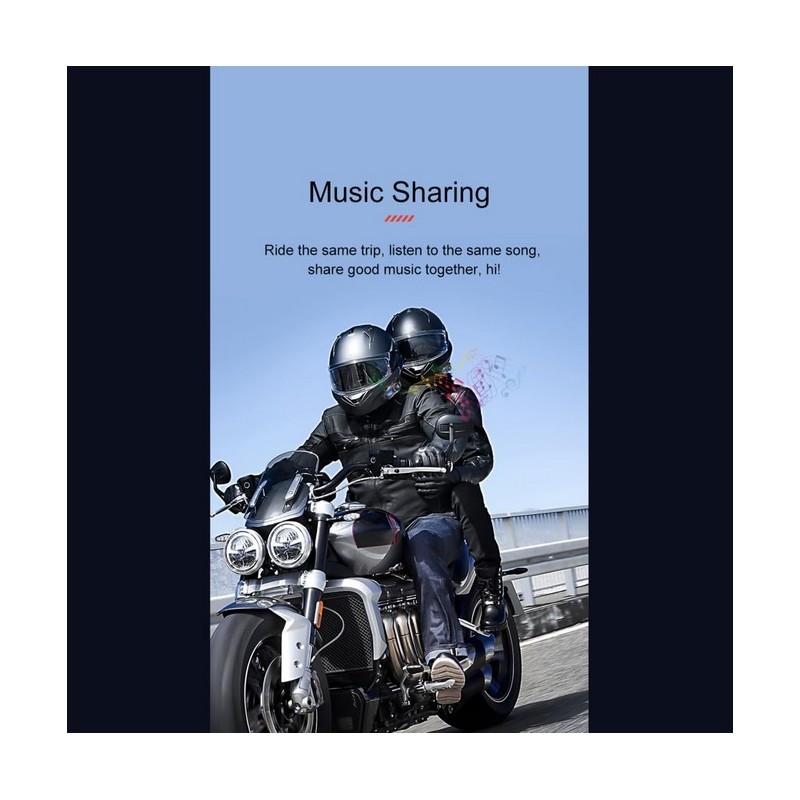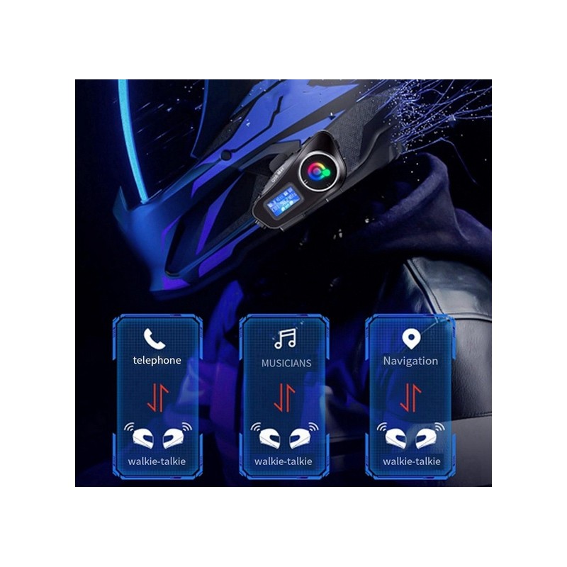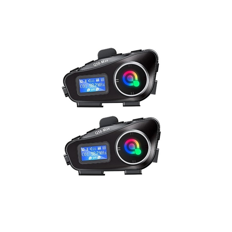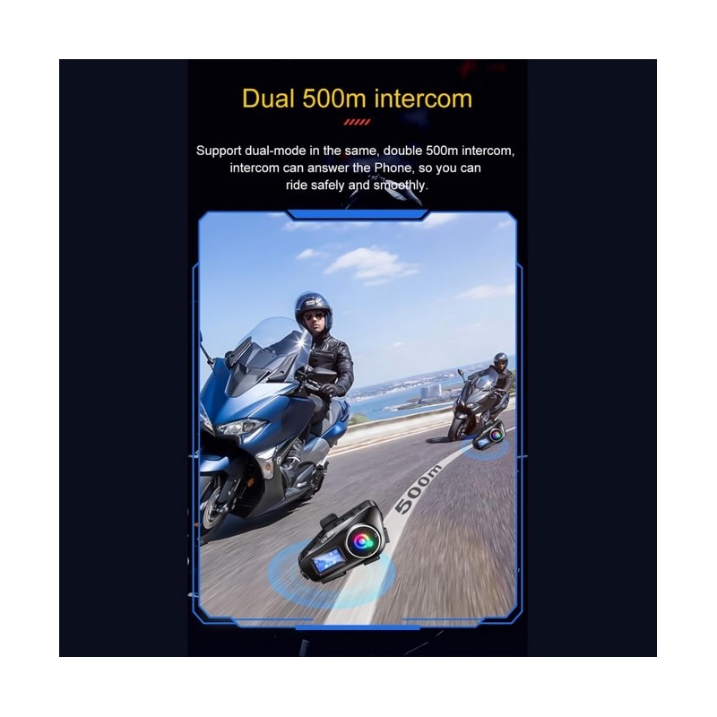 Pack de 2 intercomunicadores para casco de moto por bluetooth. Distancia de funcionamiento de hasta 500 metros. Bateria recargable de 1000 mAh con autonomia de 13h en modo comunicacion, 25 horas en modo musica y 300 horas en modo espera. Compatible con tarjeta de memoria micro SD hasta 32GB. Conectividad con telefonos, GPS y otros dispositivos con bluetooth. Modelo impermeable con proteccion IP65. Tecnología avanzada de reducción de ruido CVC para eliminar el eco y el ruido ambiental. Incluye 2 intercomunicadores, accesorios y manual.