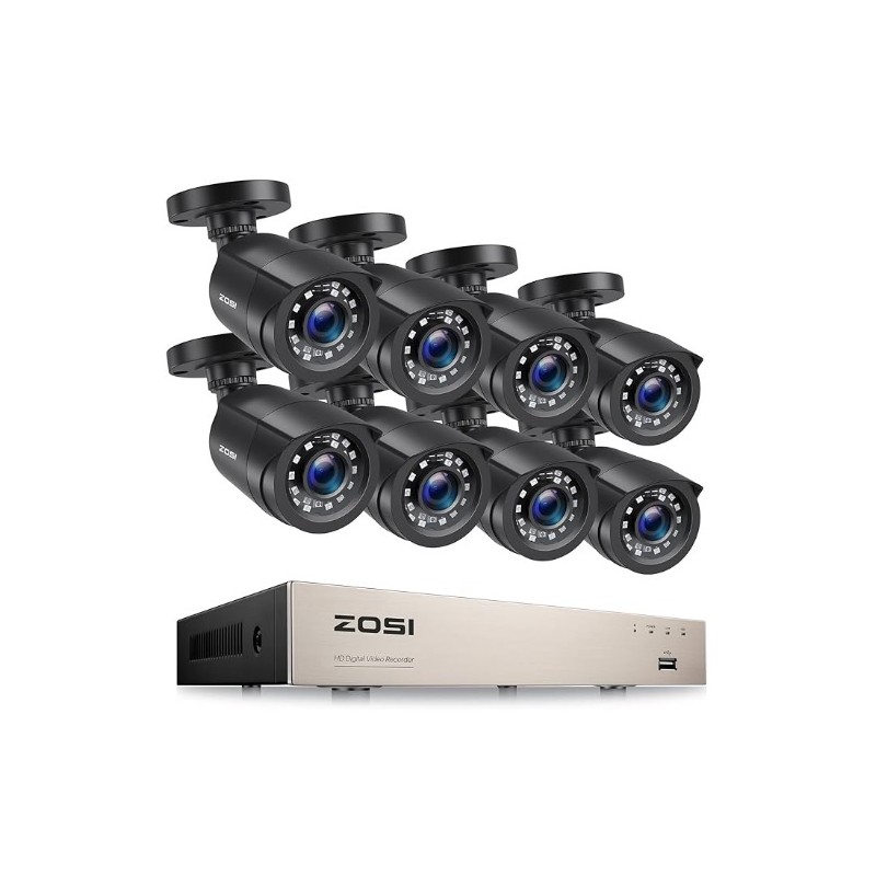 Sistema de videovigilancia profesional compuesto por 8 camaras a color resolucion HD 1080p impermeables con 24 LED para vision nocturna y sensor de movimiento con grabador de 8 canales. Con este sistema de camaras de vigilancia podra controlar y grabar su casa, local, negocio u oficina en todo momento a tiempo real desde su movil, tablet o PC. Sistema de deteccion de movimiento con alertas y envio de imagenes al email. Tecnologia P2P. Compatible con Windows, Mac, Iphone y Android. Grabador compatible con disco duro SATA de 3,5 pulgadas hasta 4TB (no incluido) con 3 USB, conexion VGA, HDMI y RJ45. Incluye grabador, 8 camaras de vigilancia impermeables, 8 cables de video de 20 metros, adaptadores splitter, adaptadores de corriente, CD, raton USB y manual de usuario.