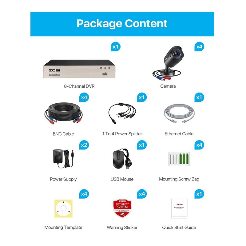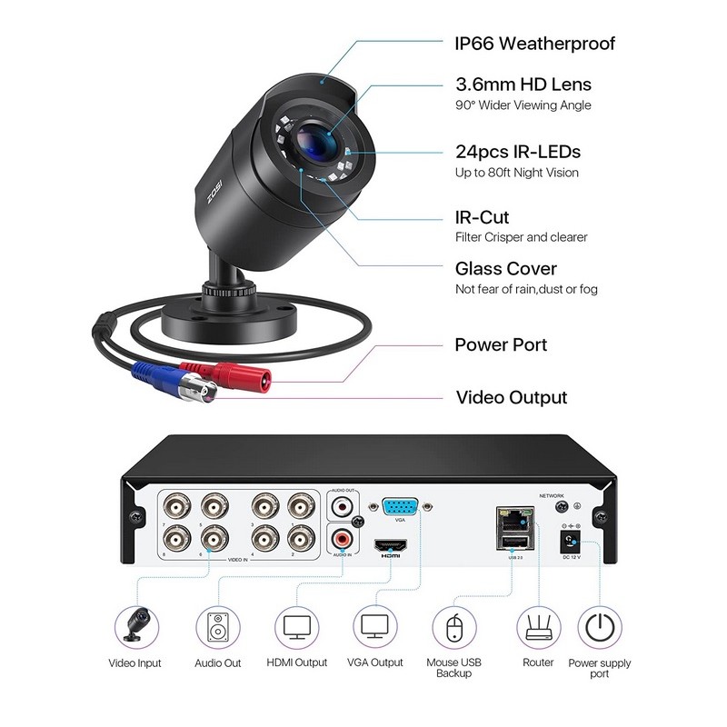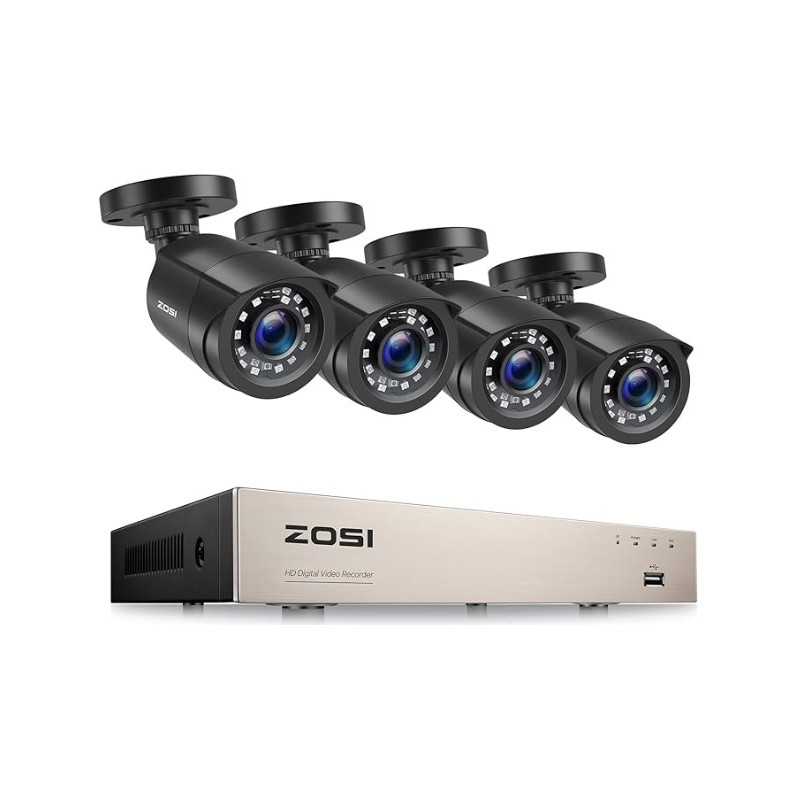 Sistema de videovigilancia profesional compuesto por 4 camaras a color resolucion HD 1080p impermeables con 24 LED para vision nocturna y sensor de movimiento con grabador de 8 canales. Con este sistema de camaras de vigilancia podra controlar y grabar su casa, local, negocio u oficina en todo momento a tiempo real desde su movil, tablet o PC. Sistema de deteccion de movimiento con alertas y envio de imagenes al email. Tecnologia P2P. Compatible con Windows, Mac, Iphone y Android. Grabador compatible con disco duro SATA de 3,5 pulgadas hasta 4TB (no incluido) con 3 USB, conexion VGA, HDMI y RJ45. Incluye grabador, 4 camaras de vigilancia impermeables, 4 cables de video de 20 metros, adaptador splitter, adaptadores de corriente, CD, raton USB y manual de usuario.